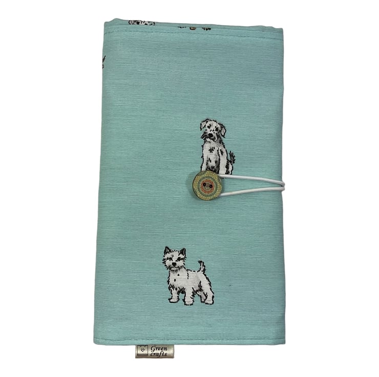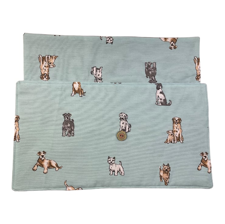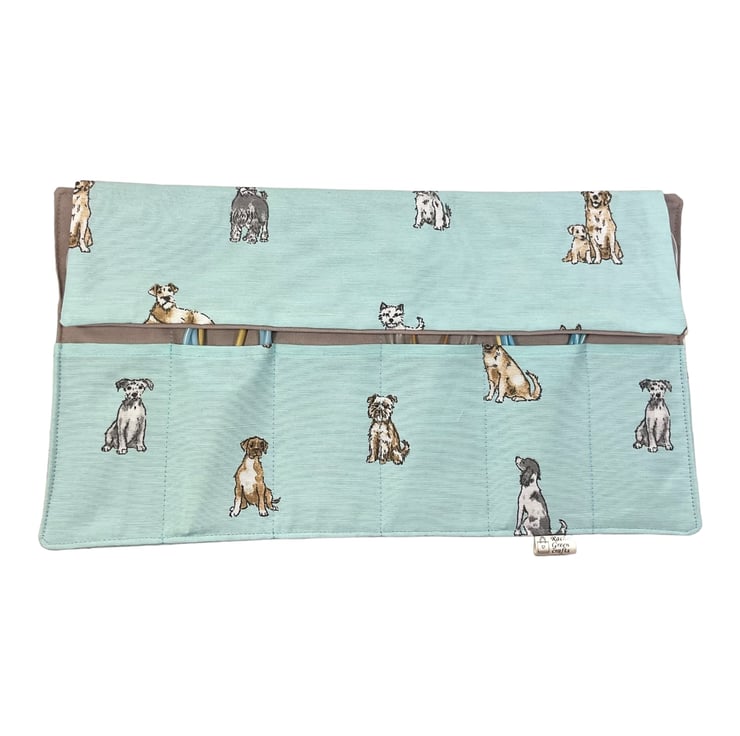 I have used a cute dog breeds print cotton/ polyester mix canvas on a turquoise background. This fabric is used for the outer, outside of the flap and lower pocket and a coffee coloured cotton canvas fabric is used to line the case, the inside of the flap and the upper needle pocket. The case is interfaced for structure and strength and topstitched all around for neatness.