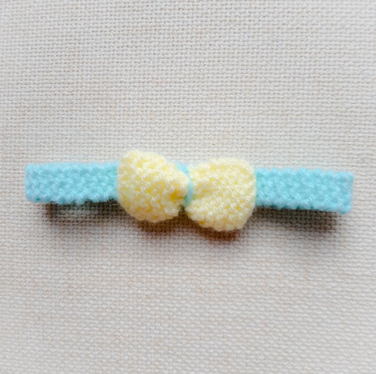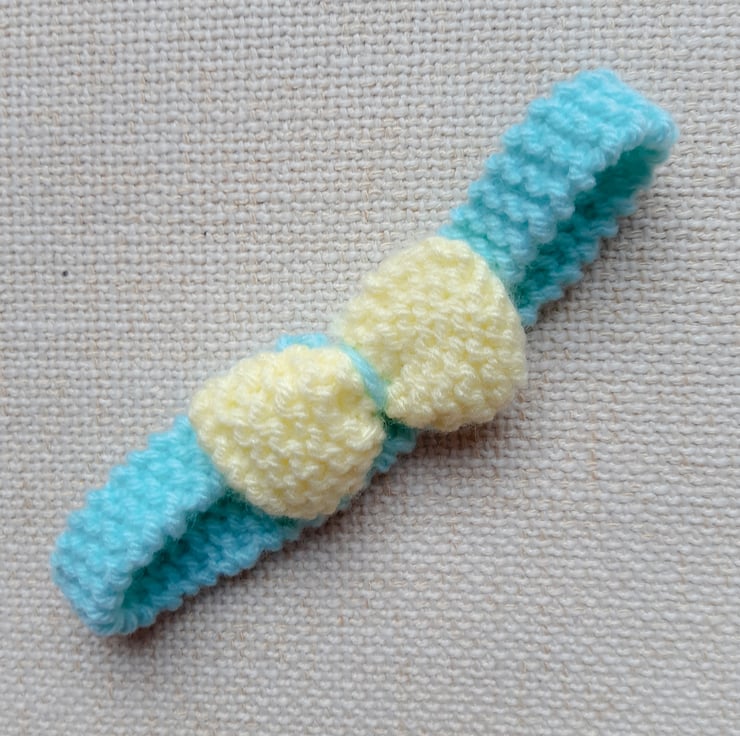 This hand knit PATTERN is for a headband for a Doll. To fit doll Height 46 cm or 18 inches. The headband is knitted in double knitting yarn using 3.25 mm knitting needles and is knit flat and embellished with a bow.