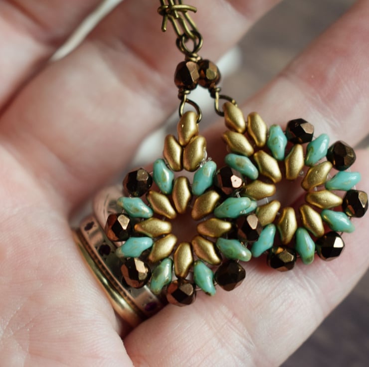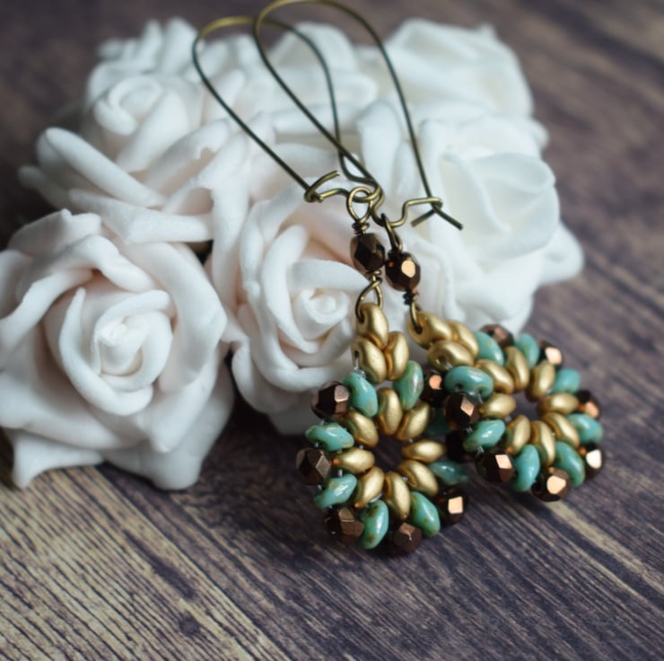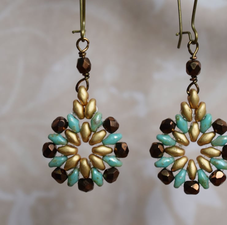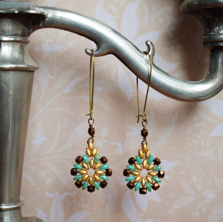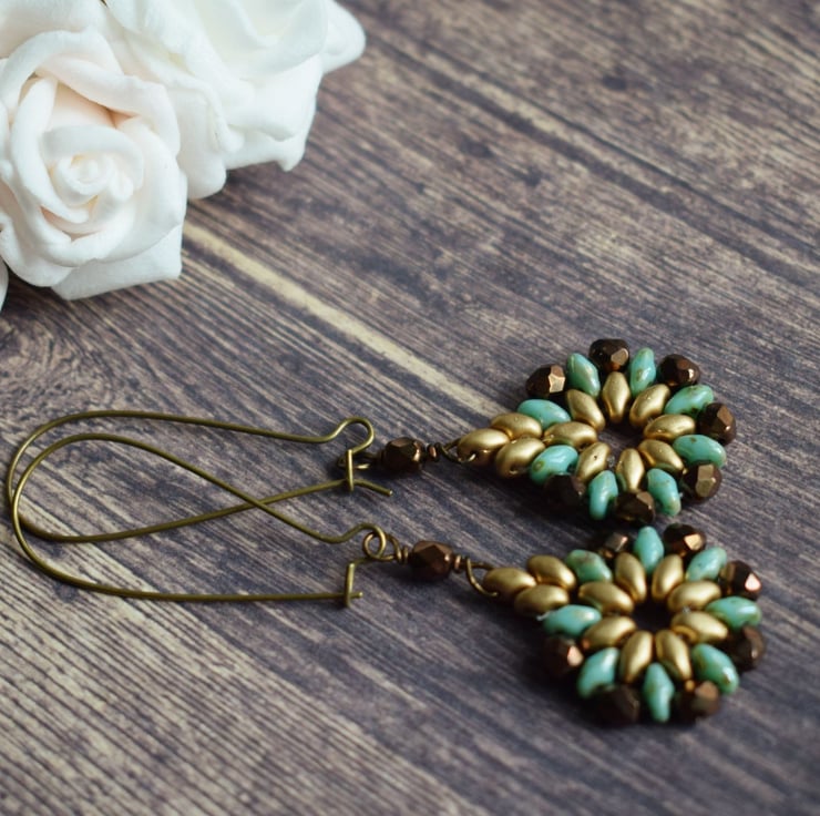 These lovely earrings beaded in shades of green, gold and brown have a wonderfully earthy feel to them with their warm, rich colours. They are hung from long bronze latchback earwires that fasten securely so you can go about your day or night without worrying if an earring is going to slip out.