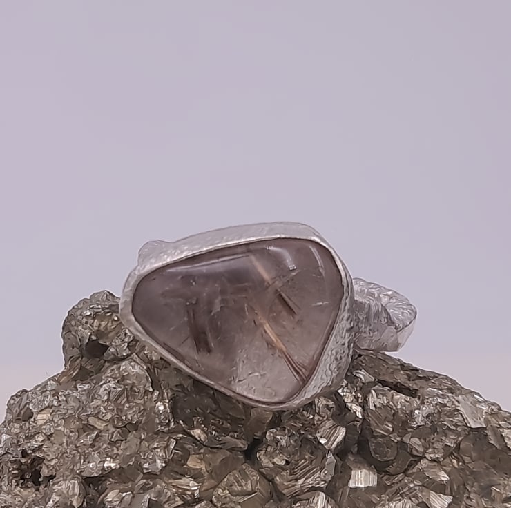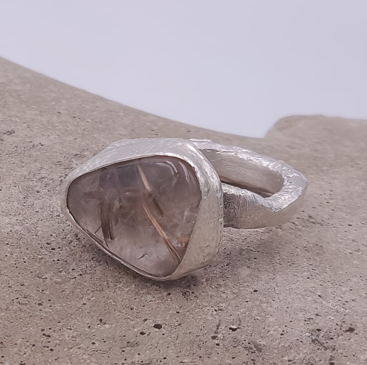 At the heart of this remarkable piece lies a freeform rutilated quartz, known for its ethereal golden or reddish needle-like inclusions that seem to capture the light. Each quartz stone is unique, with patterns that tell a story of nature's artistry, making every ring truly one-of-a-kind. The freeform shape of the rutilated quartz adds an organic and contemporary touch, enhancing its natural beauty and ensuring it stands out.