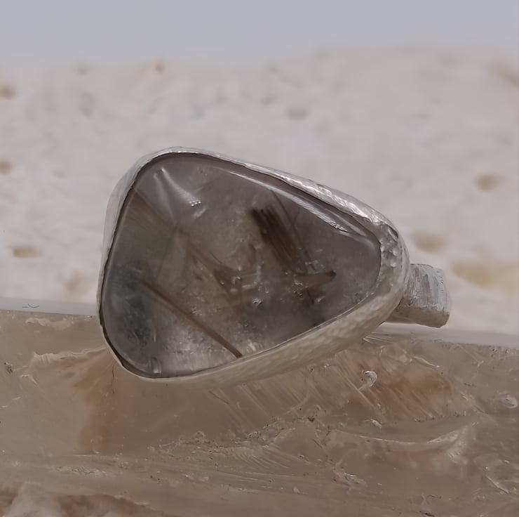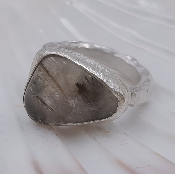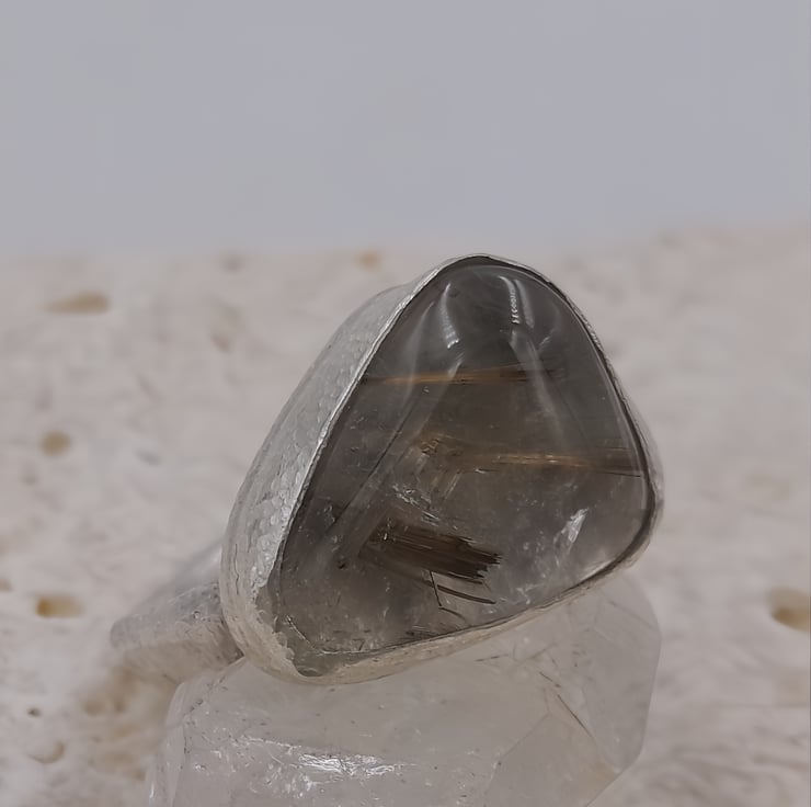 Embrace the cosmic elegance of the Celestial Quartz: Chunky Silver Ring with Freeform Rutilated Quartz, a unique piece that combines bold design with the natural beauty of gemstones. This striking ring features a band forged from premium silver, showcasing the raw and rugged textures achieved through handcrafting techniques. The band is polished highlighting the intricate details and providing a sophisticated contrast.
