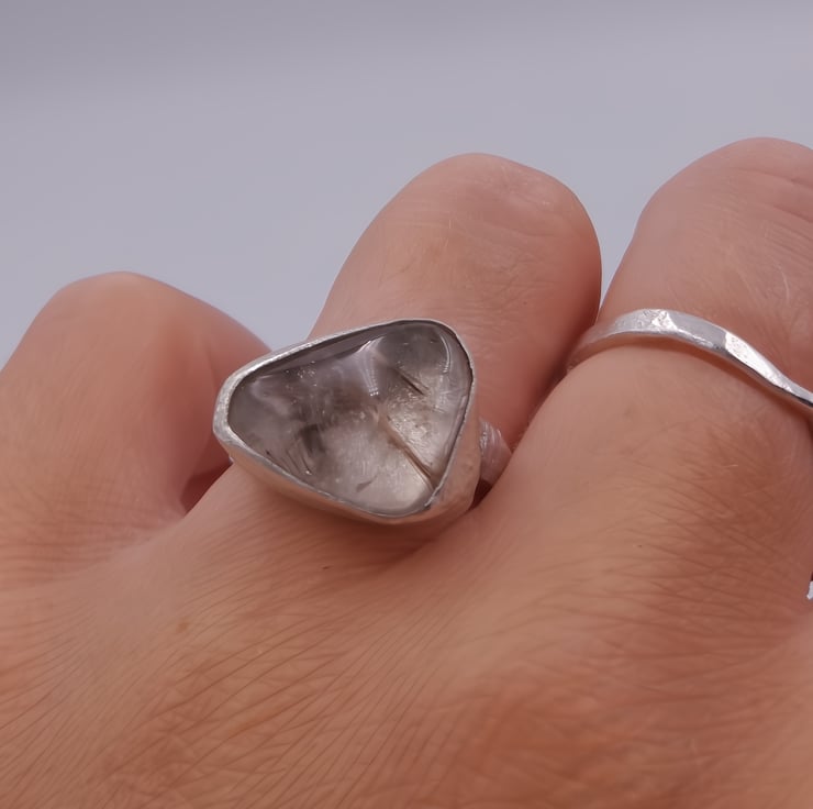 Celestial Quartz is a statement of individuality and refined taste. Perfect for those who appreciate the blend of bold design and natural elegance, this ring elevates everyday wear with a touch of luxury and serves as an eye-catching accessory for special occasions. Whether you're treating yourself or searching for a distinctive gift, the Celestial Quartz: Chunky Silver Ring with Freeform Rutilated Quartz is a timeless addition to any jewellery collection, destined to be cherished for years to come.