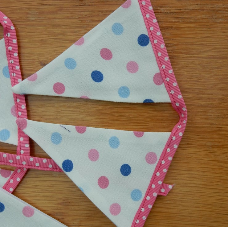 This stunning polka dot mini bunting is a little smaller but equally effective. It is made from fabric featuring pale and darker blue and pale and darker pink spots on an white background. The flags are backed in a plain white fabric making them double sided which helps them to hang well. The lovely spotted tape measures 2 metres, with the measurement from first to last flag being approx. 133 cm (52 inches). This gives a generous length of bunting, with ties at each end for hanging. Each of the 14 flags is 11cm (4 inches) deep.