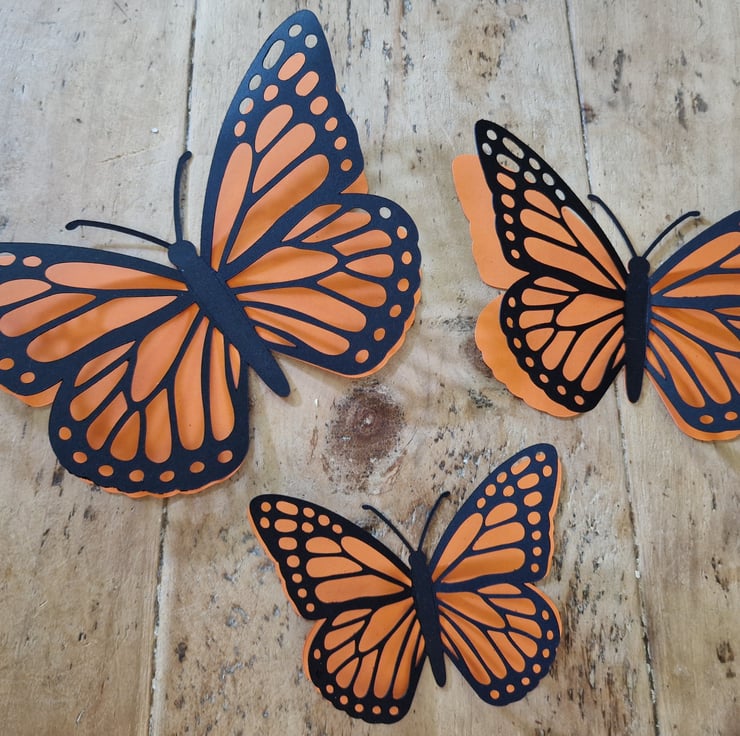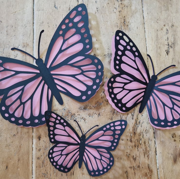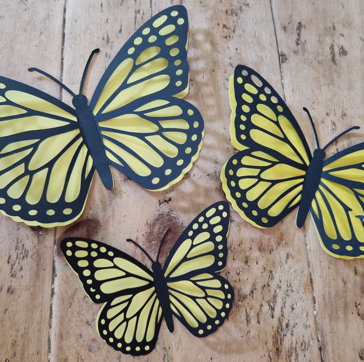 These butterfly trio's are a wonderful decorative addition to any room in the house/office/workplace etc This 3D family consists of 2 layers of high quality cardstock, one of which can be folded out slightly. to give the illusion of flight. Large butterfly measures 9" x 6", medium measures 7" x 4" and the smallest measures 5" x 3.5". Please state your colour choice when ordering.