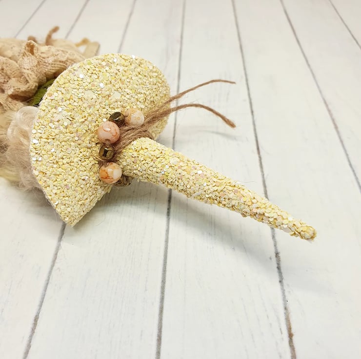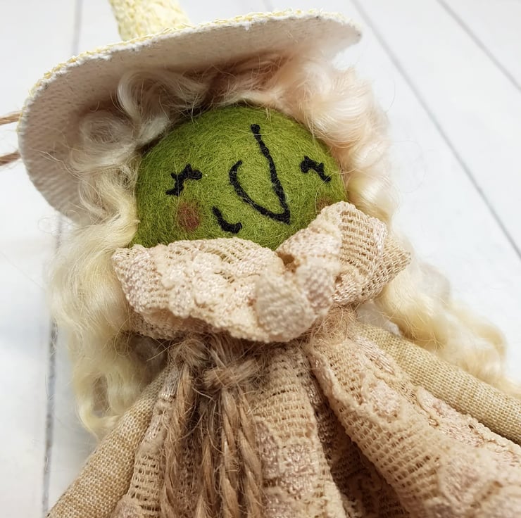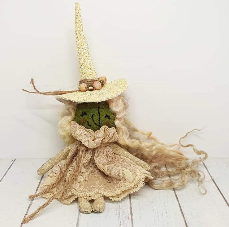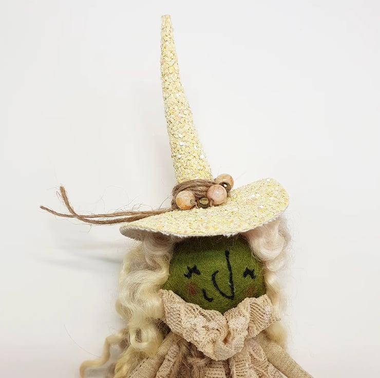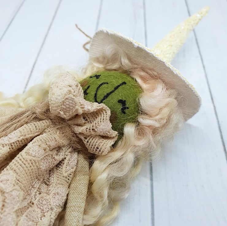 Miniature art doll with felt body and free motion embroidered face. This little witch has hand stitched lace dress with natural twine around the neck. Her hair is hand dyed wool locks and she has waxed rosy cheeks. Her hat is hand stitched and sewn into place with twine and beads. She measures roughly 17cm tall. This is for decorative purposes only and not a toy.