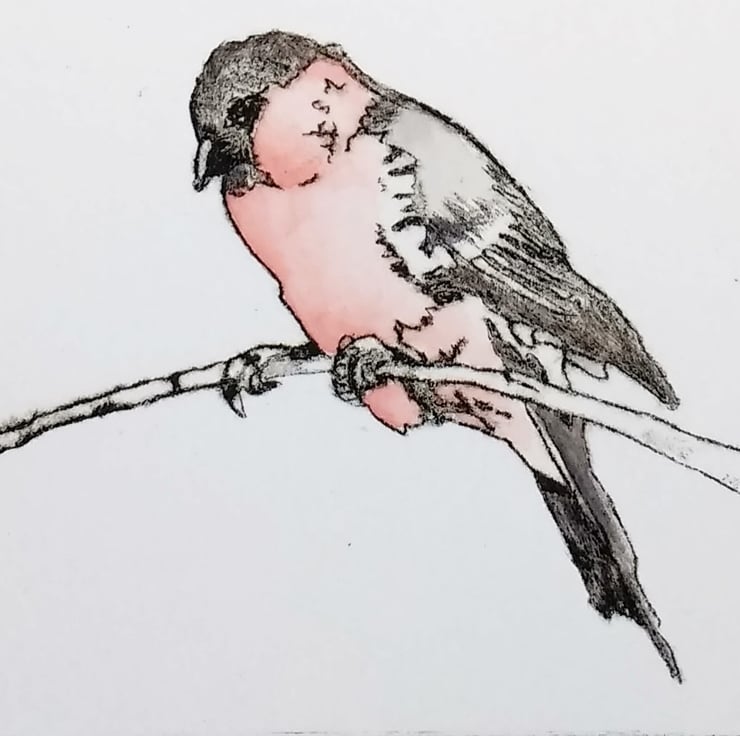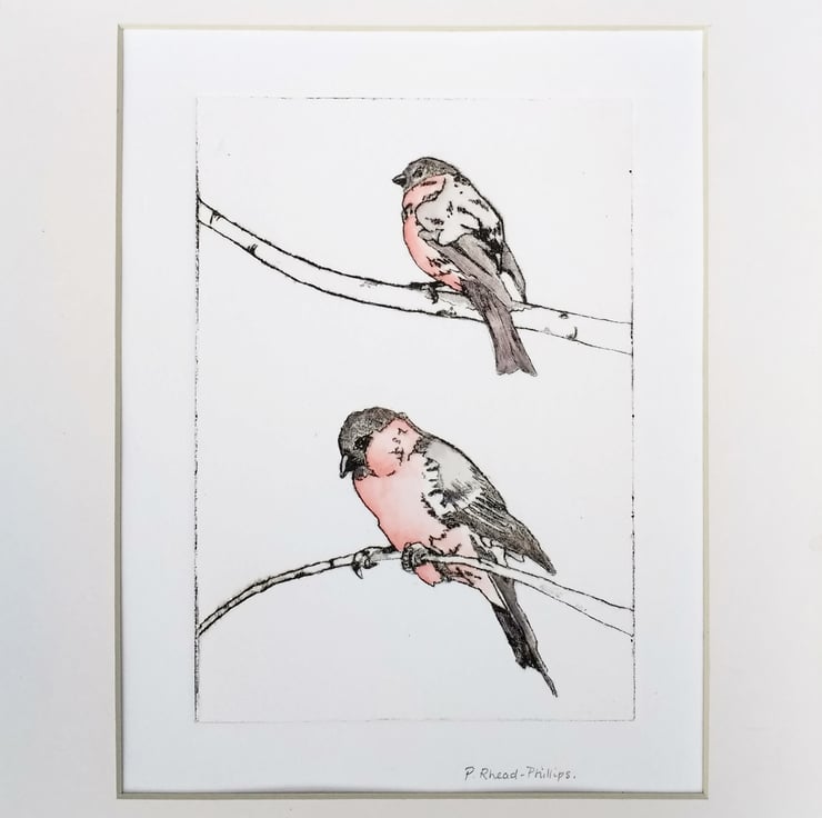 Drypoint etching of two Bullfinch. Hand painted with artists quality watercolour.