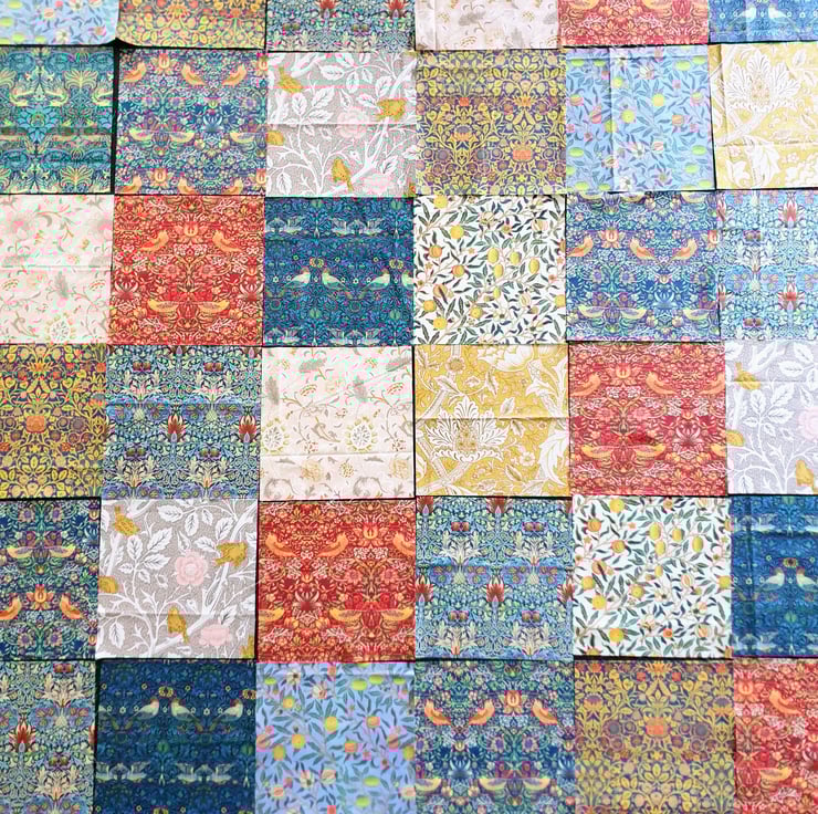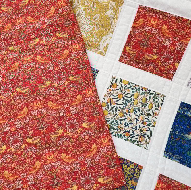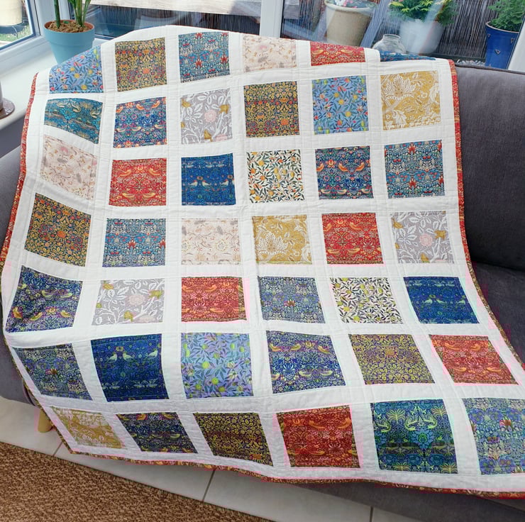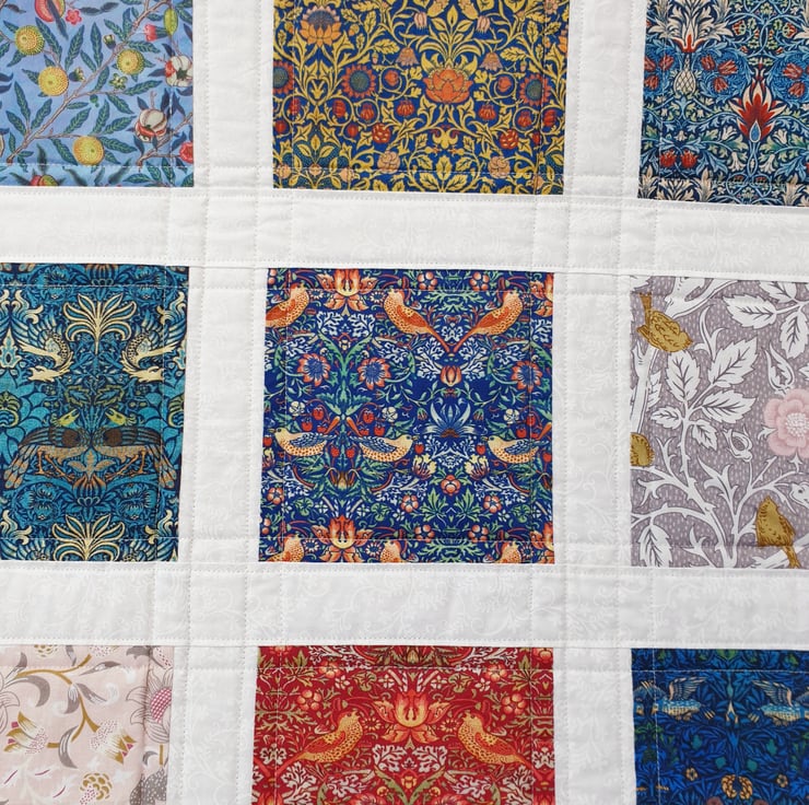 I love William Morris so decided to make this quilt from 10 different prints. After cutting each square individually, I bordered them with a light John Louden fabric to showcase the different designs better.