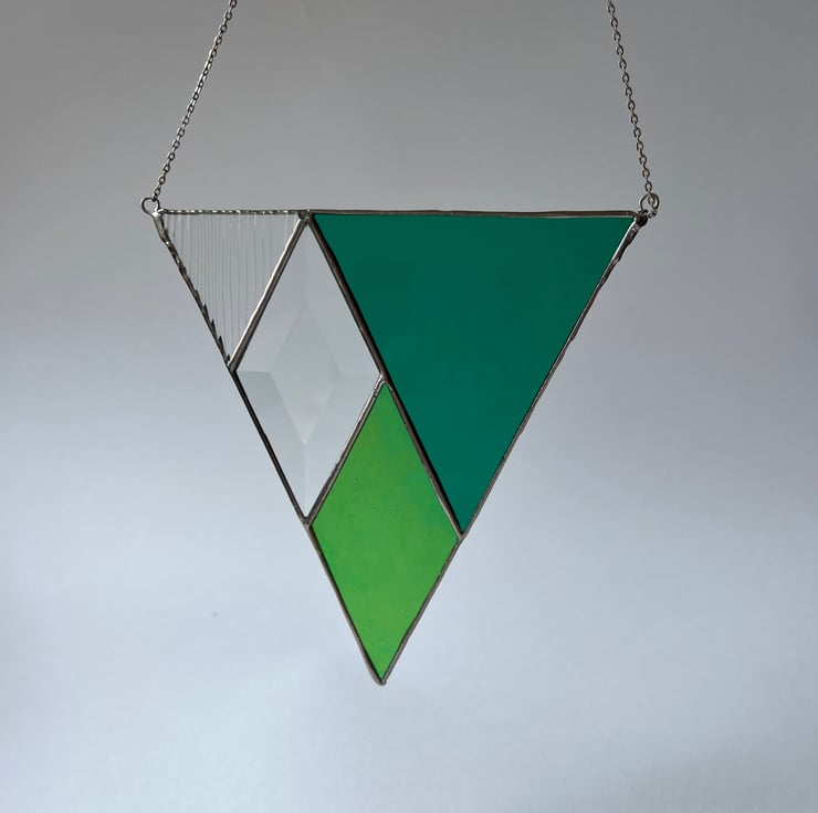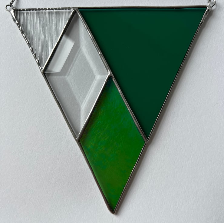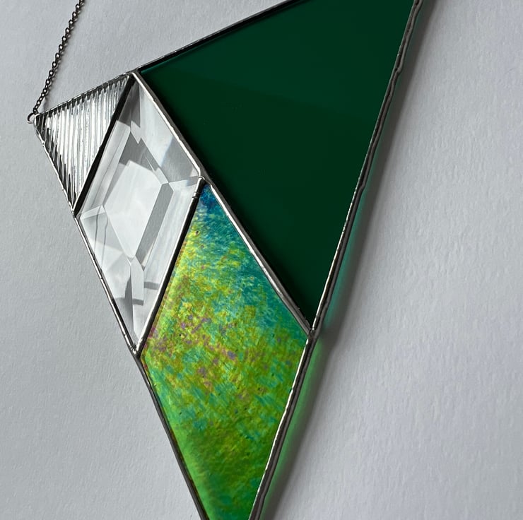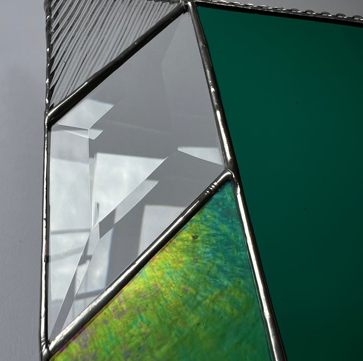 A simple, geometric design suncatcher made of rich forest green, iridescent leafy green, and textured reeded glass with a bewitching faceted bevel.
