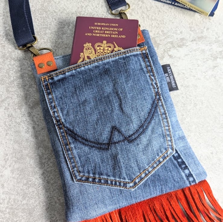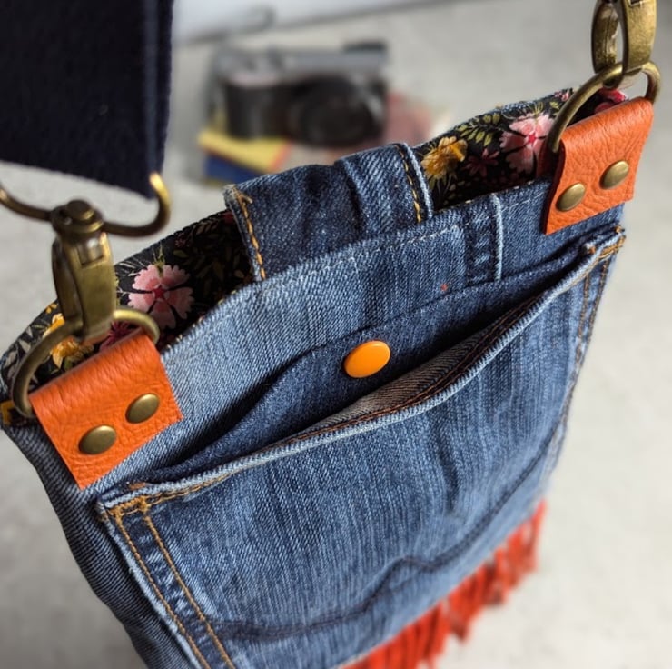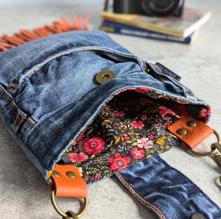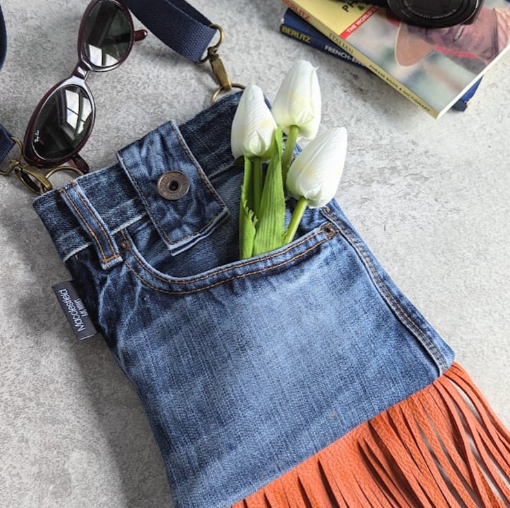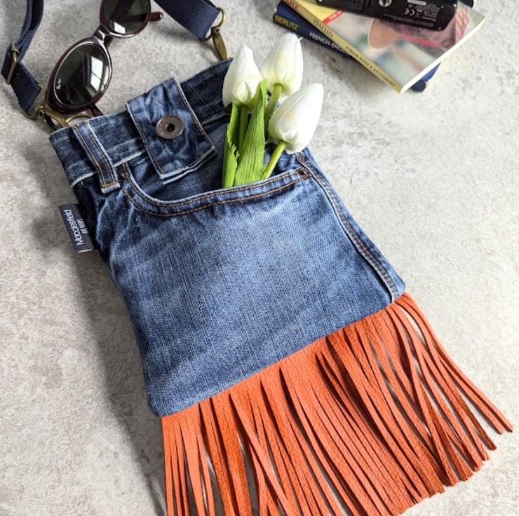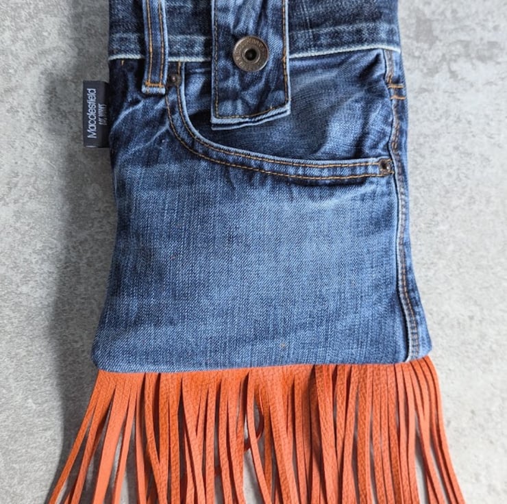 Recycled denim and hand cut orange leather fringing and detailing. Well loved denim jeans have been recycled into a super funky small cross body bag. Perfect for festivals, partying or just having a good time.