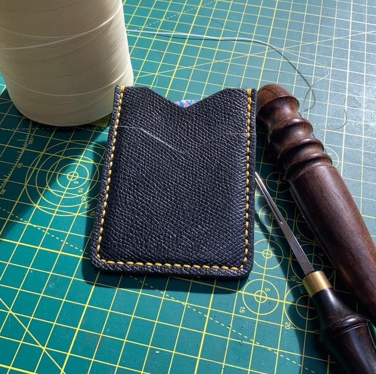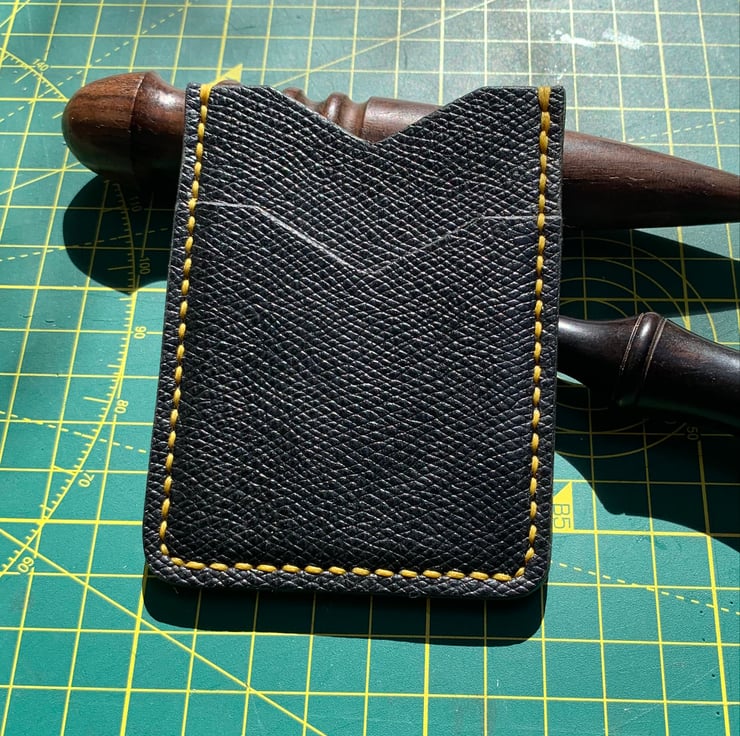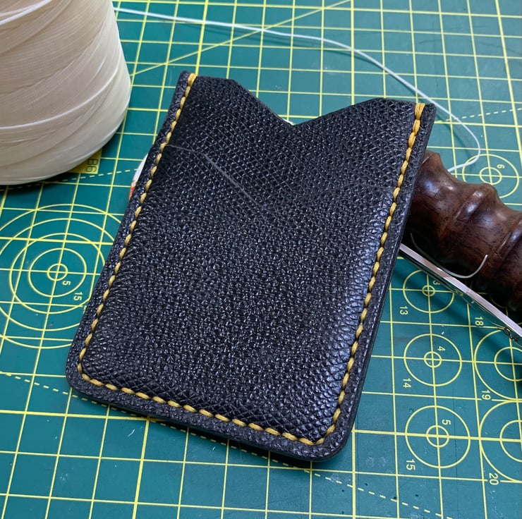 The card wallet is hand sewn using traditional saddle stitching with yellow Italian slam thread for superior strength. The edges are burnished to seal the leather so it retains its natural oils and won't dry out.
