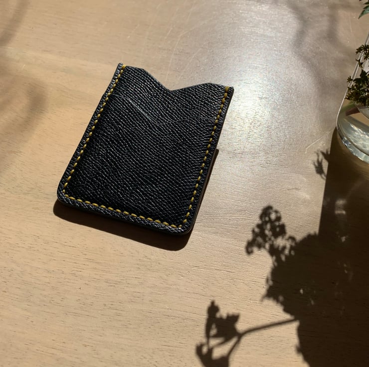 The Tinie card holder is handcrafted using fine hatch grain leather in black. It is a soft, semi- firm leather that feels very tactile when handling.