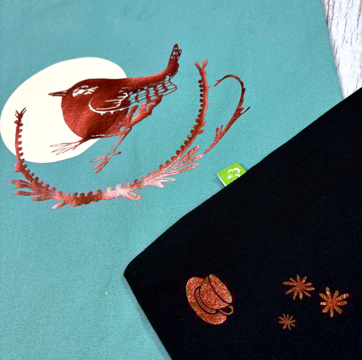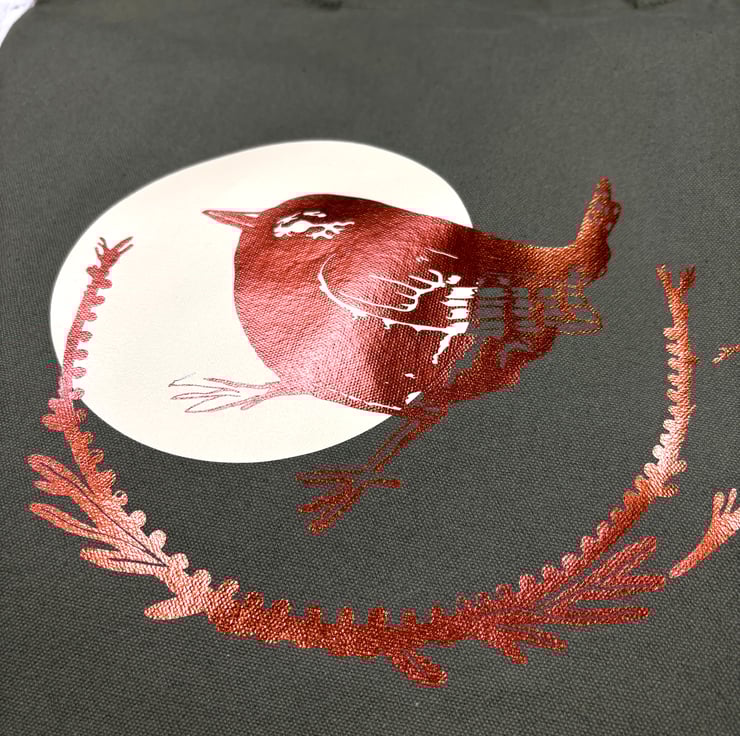 This wonderful bag features my little wren drawing, added by ourselves in shiny copper in our Yorkshire home studio.
