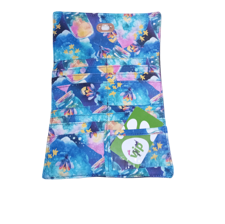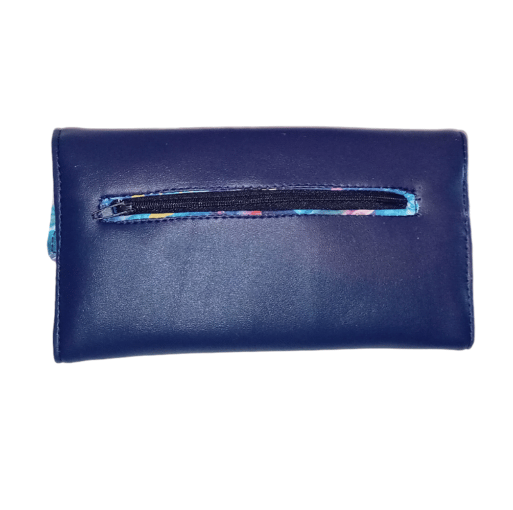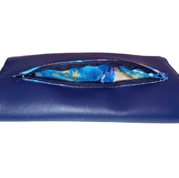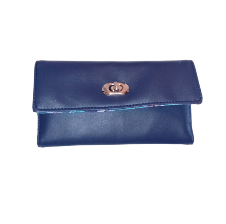 A navy blue leatherette purse with dragonfly fabric lining, zipped pocket on the back and a twist and lock closure. This purse also features a photo ID pocket.