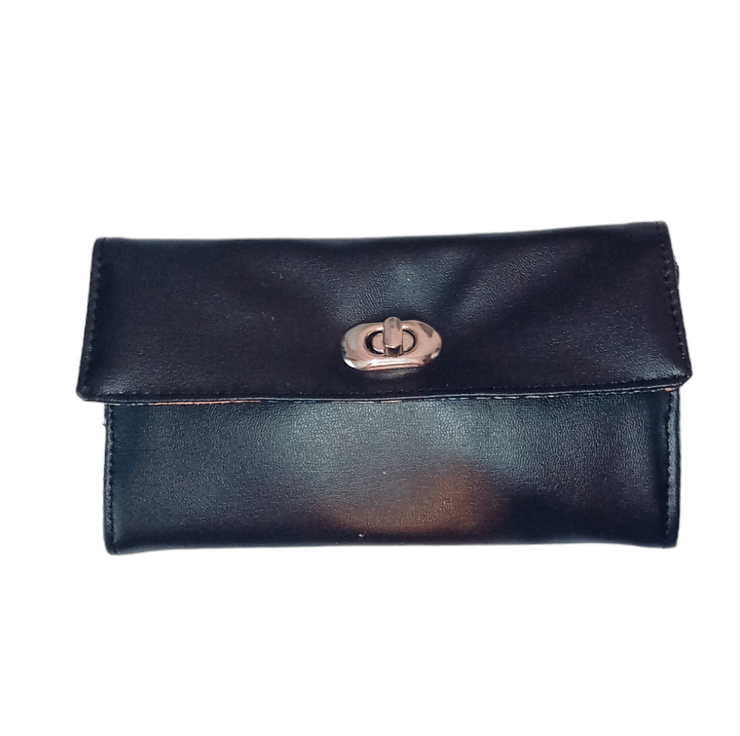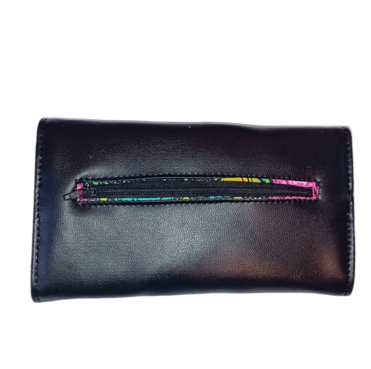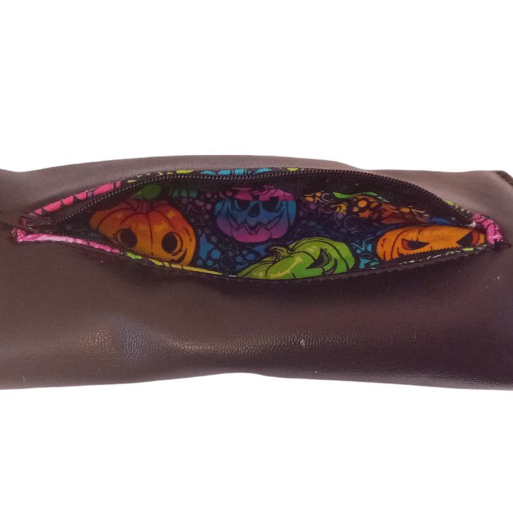 Black leatherette purse with neon pumpkin lining, zipped pocket on the back and a twist and lock closure. This purse also has a photo ID slot.