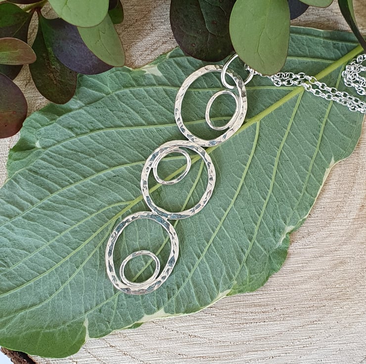 This sterling silver necklace features a fabulously tactile hand forged and elongated triple circle pendant. Each of the pendant's three elongated circles also feature an oval shape positioned randomly. It has a polished hammered texture and is perfect for everyday wear.