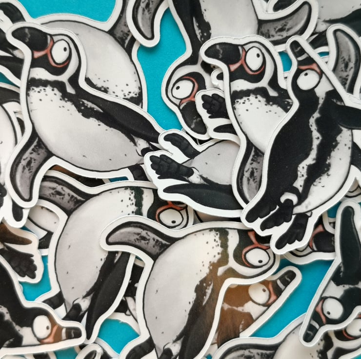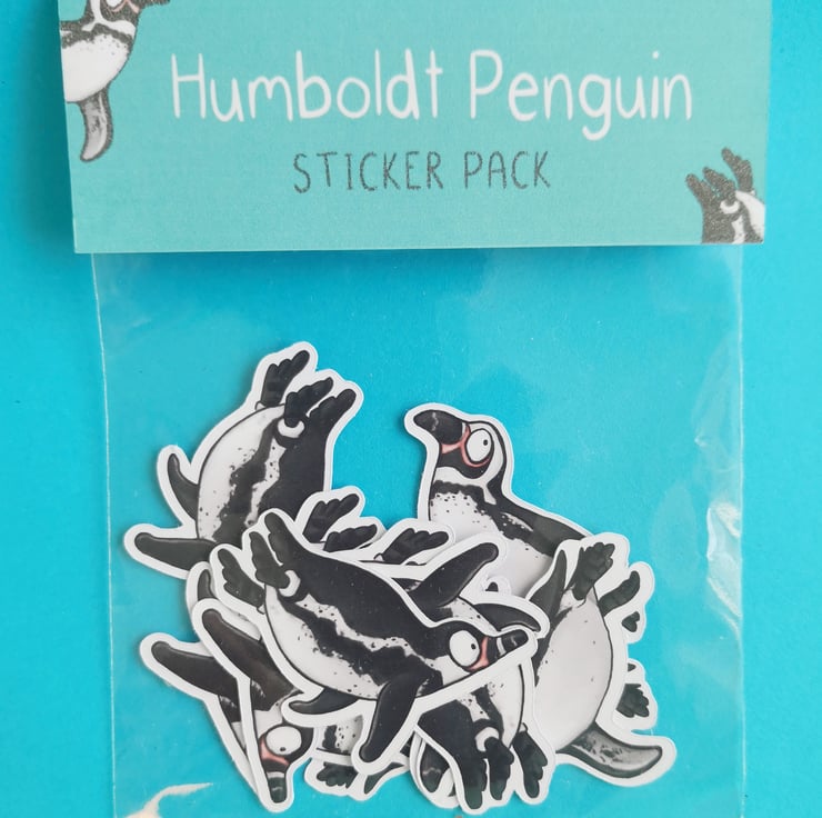Pack of handmade assorted illustrated Humboldt penguin stickers.