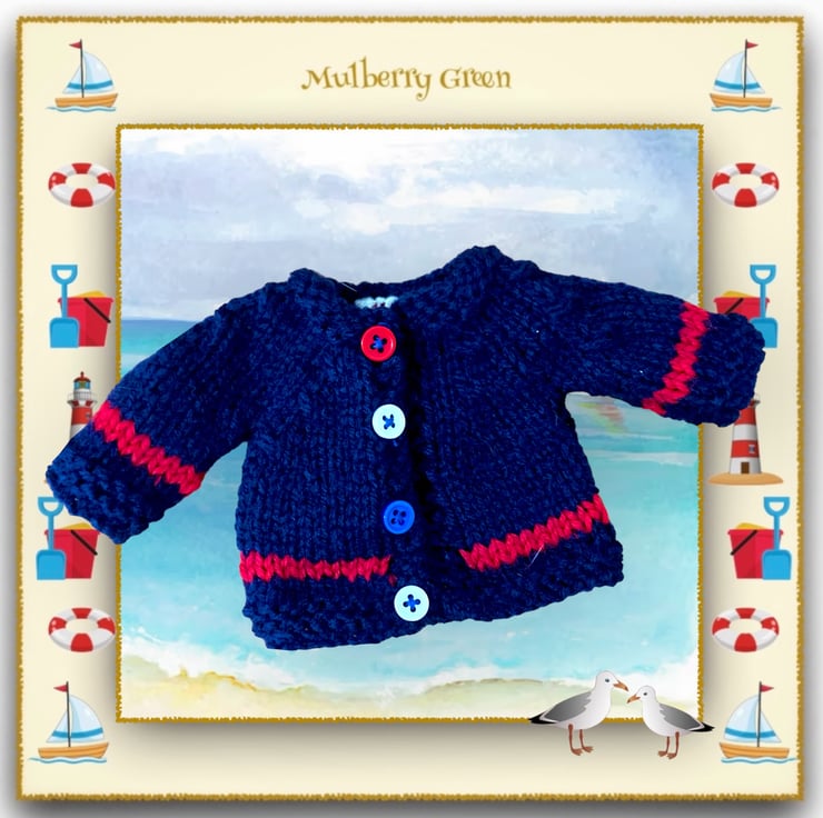 A lovely little navy cardigan with red stripes, finished off with four little buttons, to fit the Mulberry Green characters. It looks lovely with any of the nautical dresses.