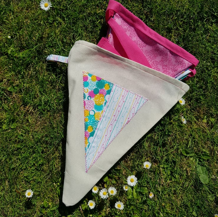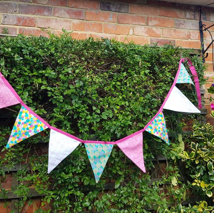 These lovely cotton fabrics make a cheerful bunting to brighten up your garden, conservatory or indoors. Ideal for festival too.