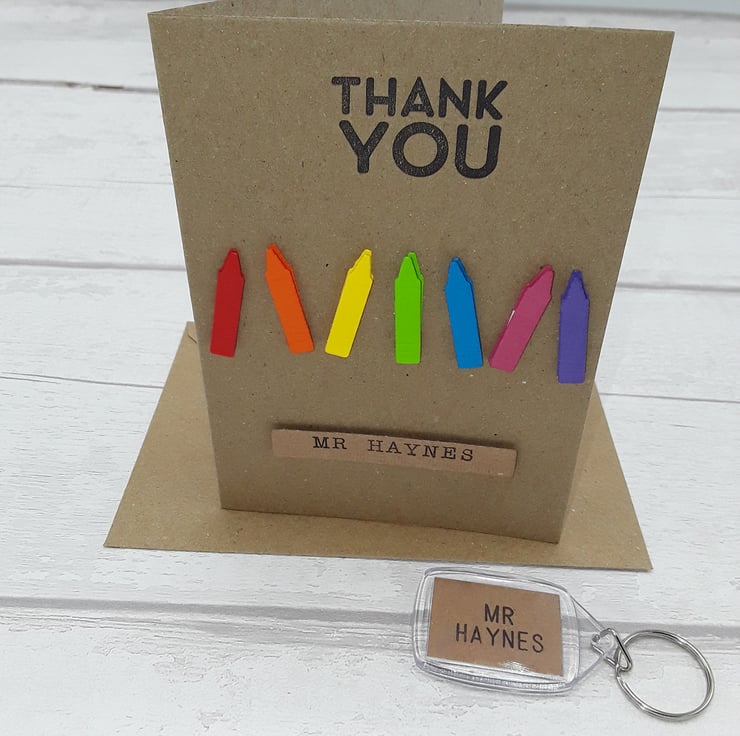 This listing is for a personalised thank you teacher/teaching assistant/nursery staff card, envelope and key ring.