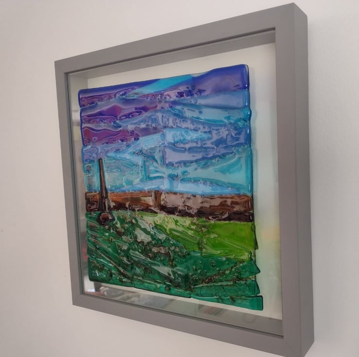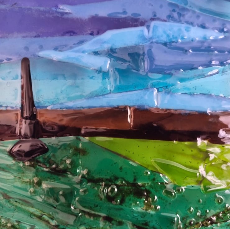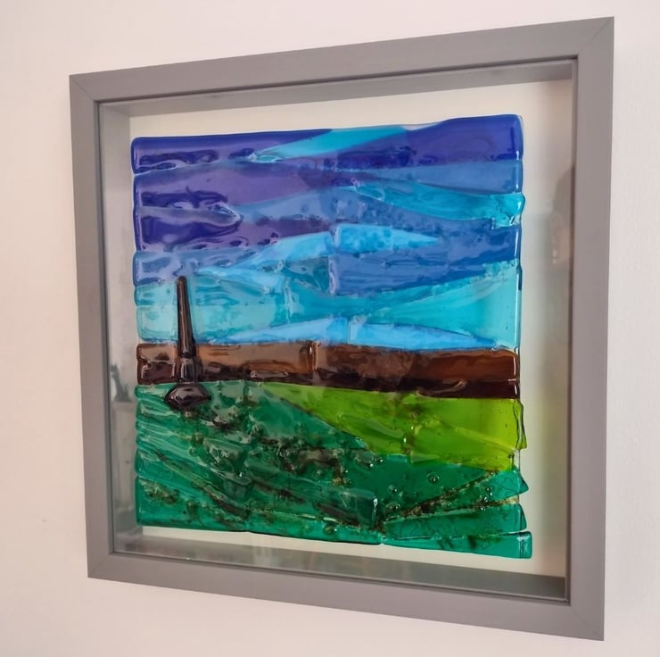 Part of my landscapes series, this fused glass wall art depicts the monument at Ham Hill Country Park. The style is semi-abstract, giving an impression of the landscape rather than a lifelike depiction. My method is to take lots of small pieces of glass and arrange them in a slightly haphaward way, bringing the image together gradually like a patchwork. Glass fragments and powders are used to fill any gaps, enhancing the effect. The piece is then fired to over 800 degrees celcius, fusing together all the pieces into one solid picture.