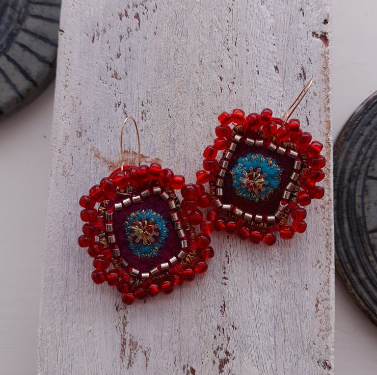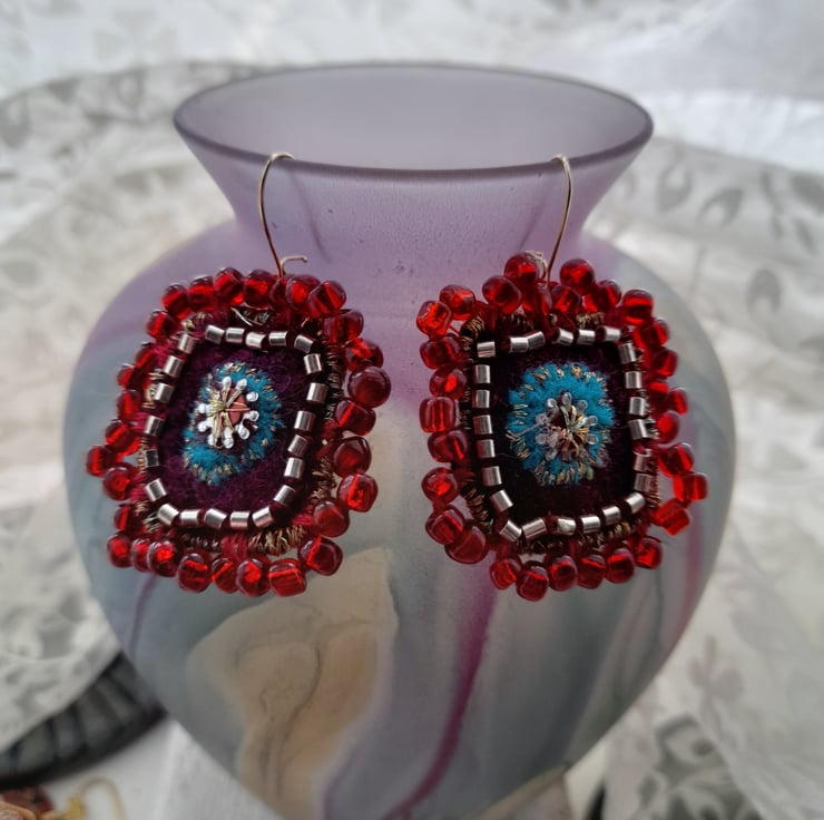 These beaded earrings measure approx. 3.5 cm x 3.5cm all hand stitched onto a felted wool base with some different types of beads They have silver ear wires. You wont ever find the same ones anywhere else