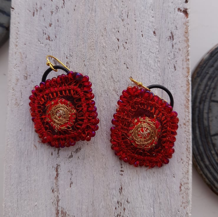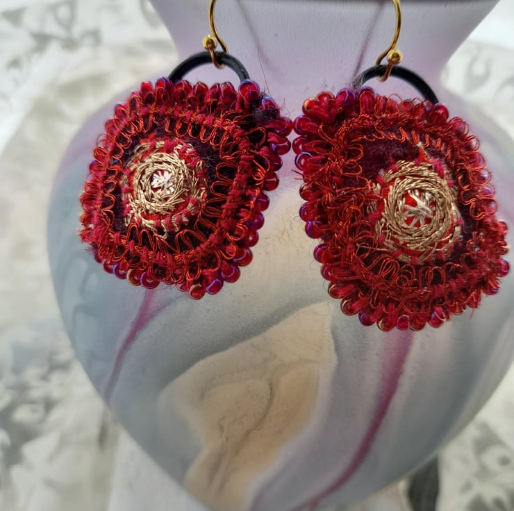 These beaded earrings measure approx. 3 x 3.5cm all hand stitched onto a felted wool base and some gold thread in the centre and beads They have gold plated ear wires. You wont ever find the same ones anywhere else