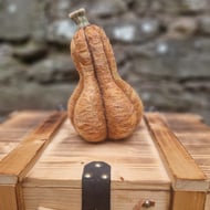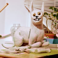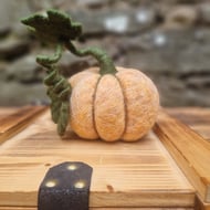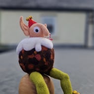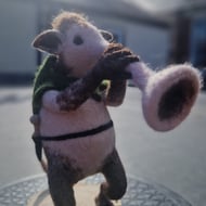 A handcrafted, needle-felted sculpture of a chicken with a big pink worm (and goodness, she's happy about that). Made of yellow felt with brown spots and wire feet attached to a round wooden base (a charity shop find). The whole measures 4 inches by 4 across the base, and 5.5 inches tall.