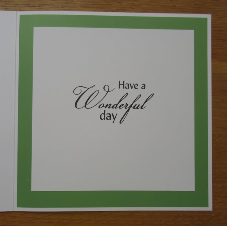 This lovely card in shades of green features the image of a car in the workshop for repairs. I have used quality striped and spotted papers for the background and framed the image with a decorative matt die cut from silver card. Finally a Birthday greeting was added to finish the card. The inside has been finished to coordinate with a stamped message which reads Have a Wonderful Day.