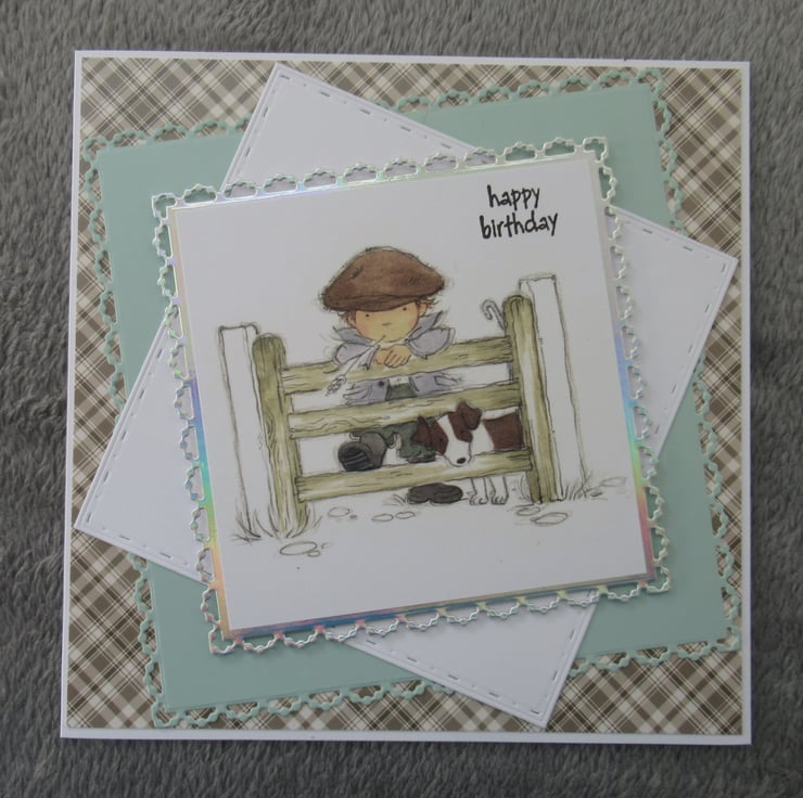This lovely card in shades of green and brown features the image of a boy and his dog leaning on the farm gate. I have used quality card for the background and layers and framed the image with a decorative matt die cut from silver card. The inside has been finished to coordinate with a stamped Happy Birthday message.