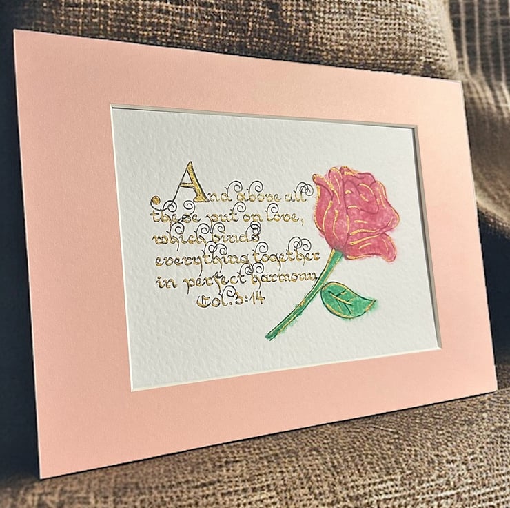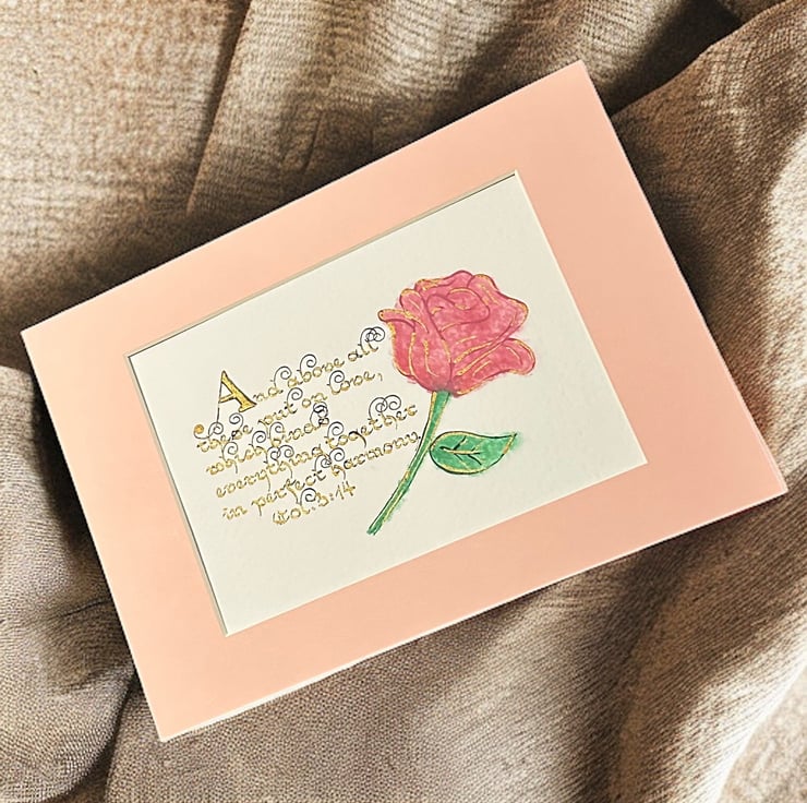 This exquisite piece has been lovingly hand-calligraphed on high-quality hammered white card. The Bible verse is elegantly written in a vintage style, showcasing black letters with graceful, twirly flourishes and shimmering gold highlights. A charming pink rose, adorned with gold acrylic accents, adds a touch of timeless beauty to the artwork.