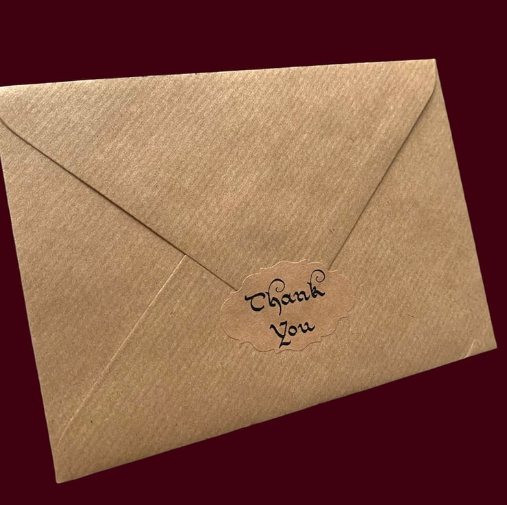 Elevate your gift-giving and correspondence with our exquisite vintage style calligraphy "Thank You" stickers. Crafted for elegance, each sticker features luxurious black calligraphy adorned with intricate swirls, set against a rich kraft brown background. Ideal for enhancing envelopes, gift bags, and boxes, these stickers bring a touch of sophistication to any occasion.