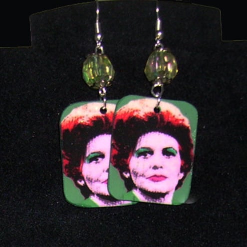 The Coronation Street character Elsie Tanner played by the brilliant Pat Phoenix is as iconic as they come. Her fiery readhead temperament, curvy shape and misadventures with men are legendary. These pop art earrings are made from shrink acrylic.