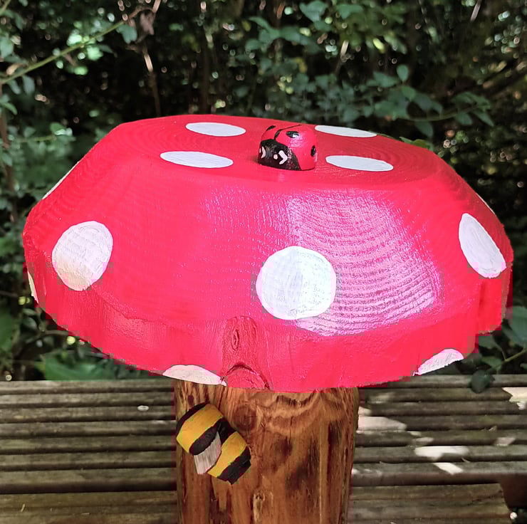 The toadstool is approx 23cm tall, 25 x 25cm across the top and 9 x 9 at the base.