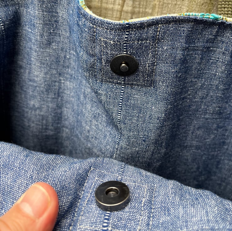 The long olive green webbing straps can be worn on your shoulder. There is a magnetic catch to fasten the top edge and a patch pocket inside.