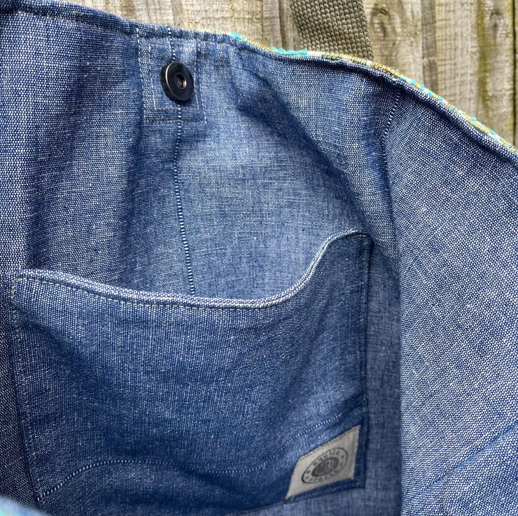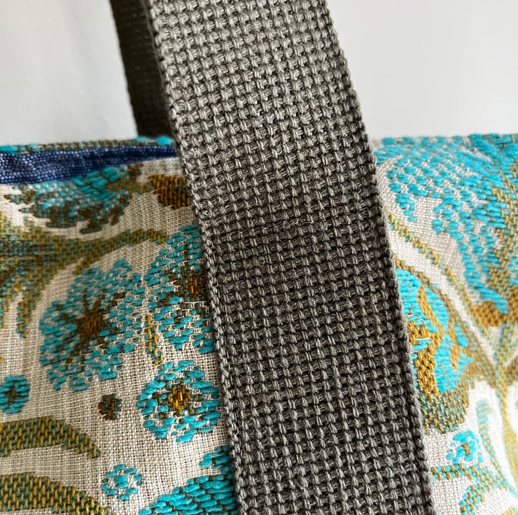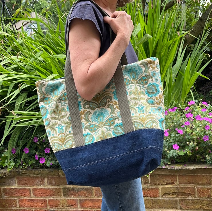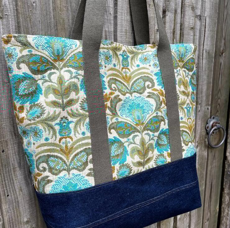 Oversize tote bag made from beautiful vintage Belgian tapestry upholstery fabric from the 1960s. I have mixed it with reclaimed denim from jeans and the bag is lined with reclaimed cotton curtain fabric in a soft denim blue.