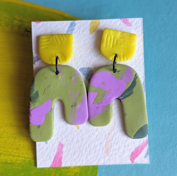 They feature large, rounded "candy cane" shape with a marbled dark green, olive green and purple finish . A small textured acid yellow arch connects to the shape with a black jump ring.