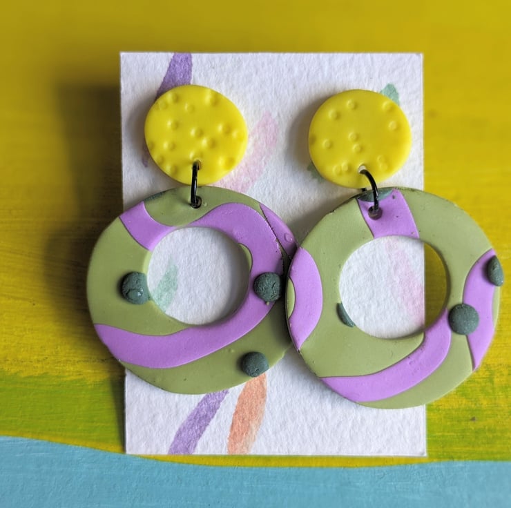 Green statement earrings! Large dangly earrings with textured olive green and purple loops, adorned with darker green dots. Topped off with a bright yellow textured disc on top, attached with a black jump ring.