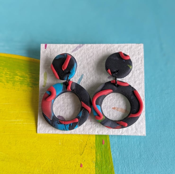 Polymer clay dangly earrings in a dark navy blue (almost black), blue and red marbled clay with added red lined texture. They're finished off with black jump rings. Small circle on top, larger hoop below.