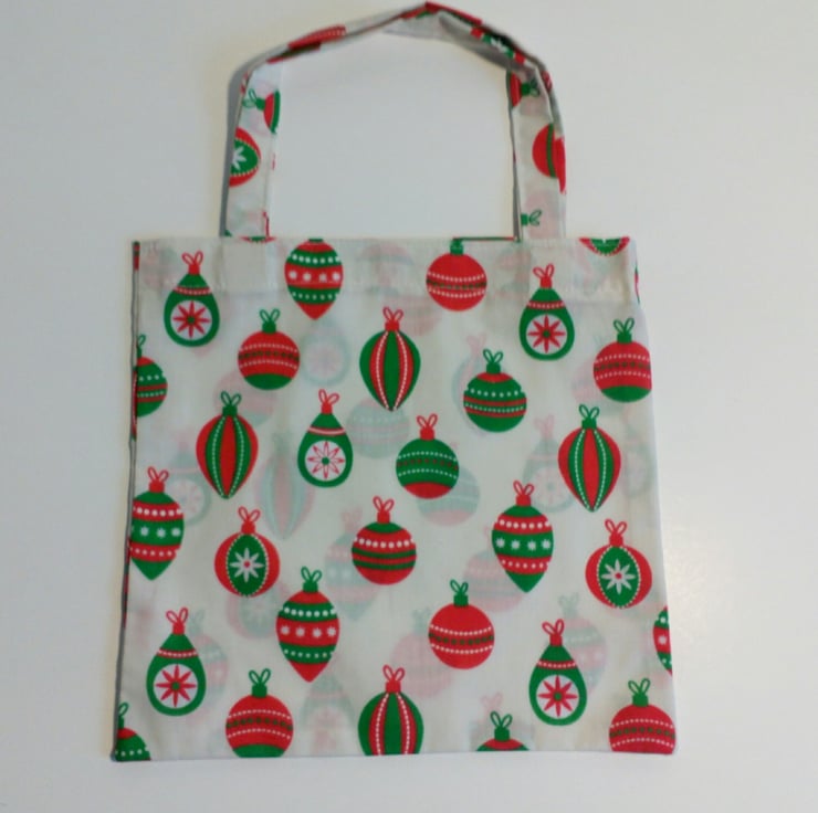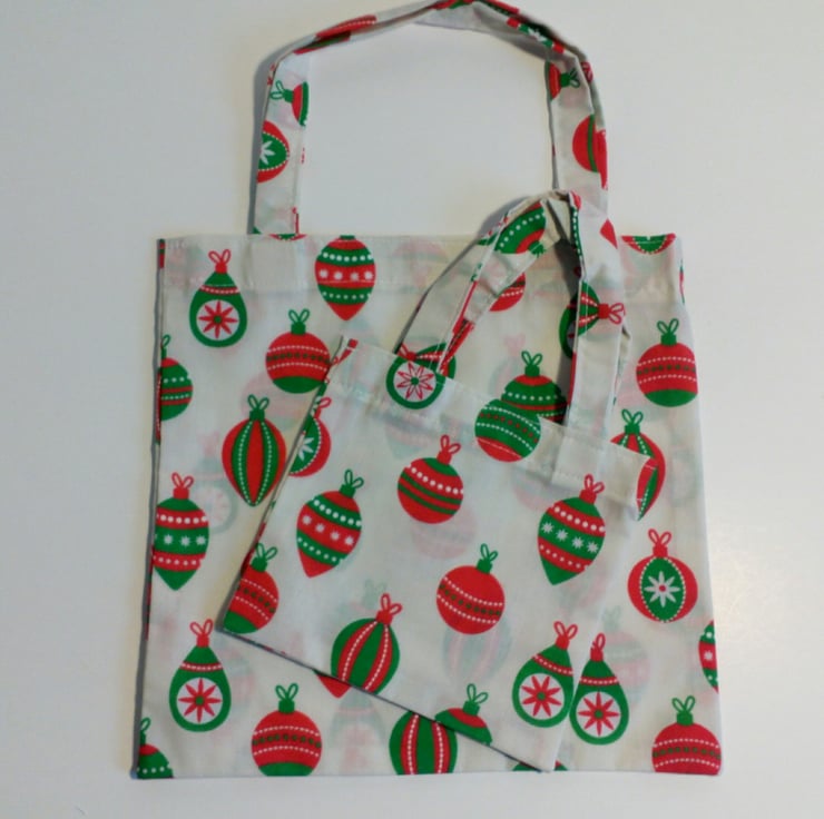 One midi size 23cm square and one mini size 14cm across and 13cm high with the same Christmas bauble design on each.