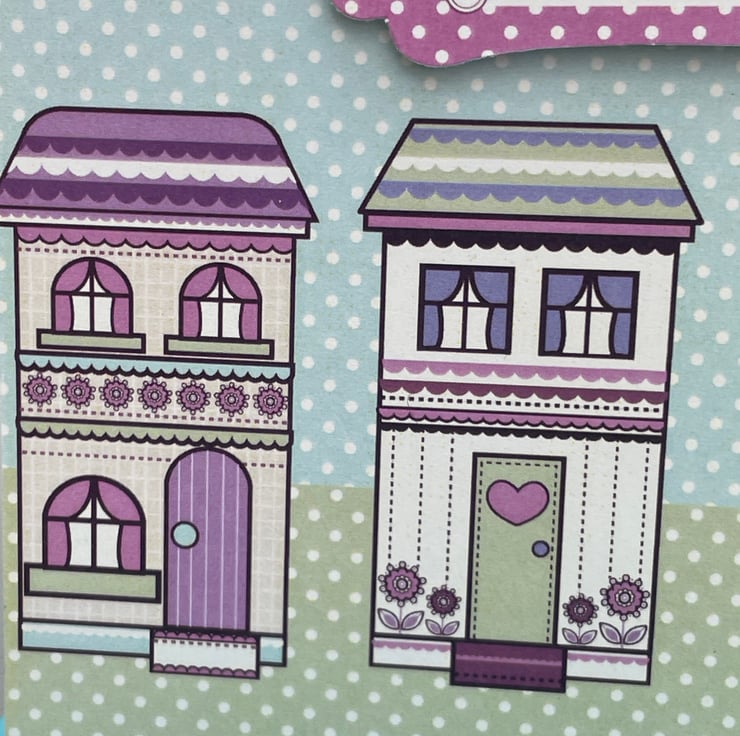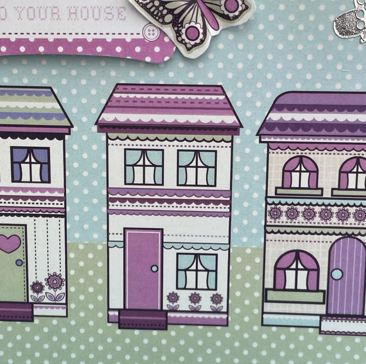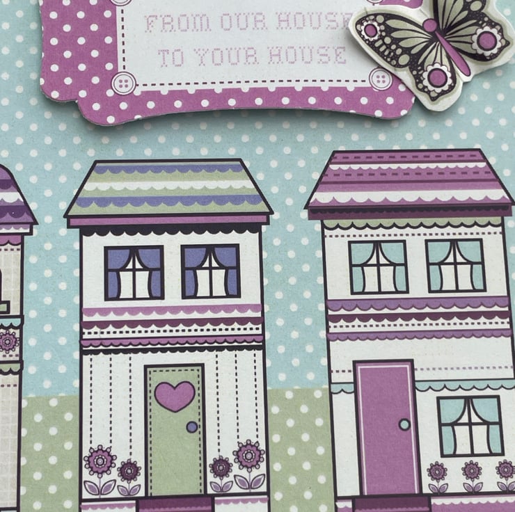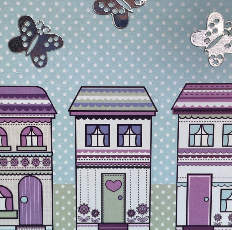 The cutest card to celebrate someones new home. This DL sized card features the cutest row of houses in candy colours.They are on a background of blue and pink polka dots and each one is unique. The greeting says From our house to your house and has butterflies decorating it. Inside the card has a New Home greeting and has more butterflies. A lovely way to send greetings to someone moving into a new home.