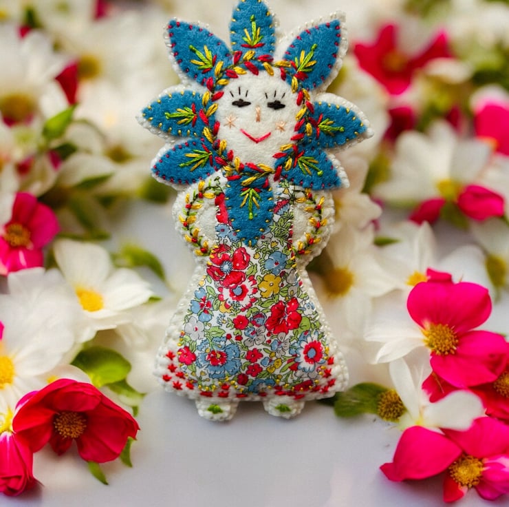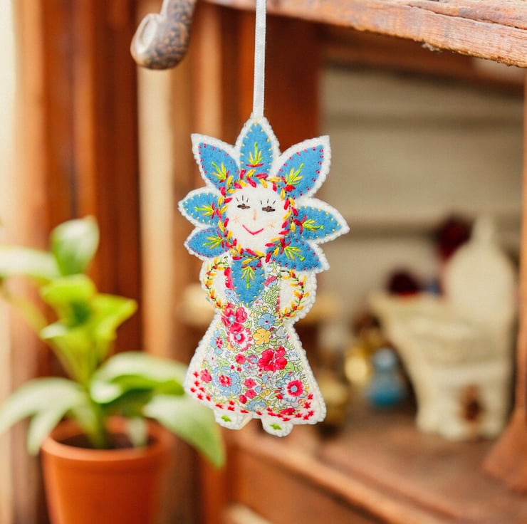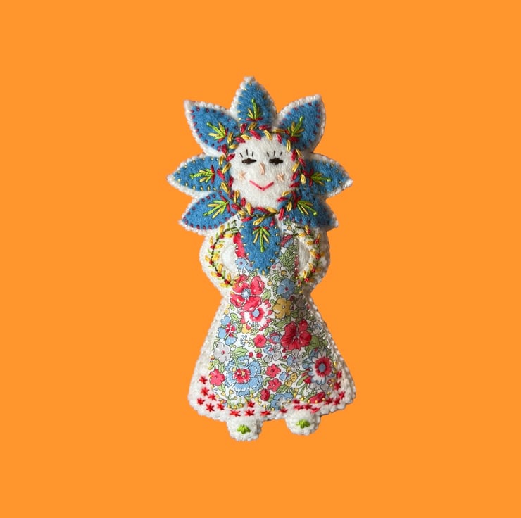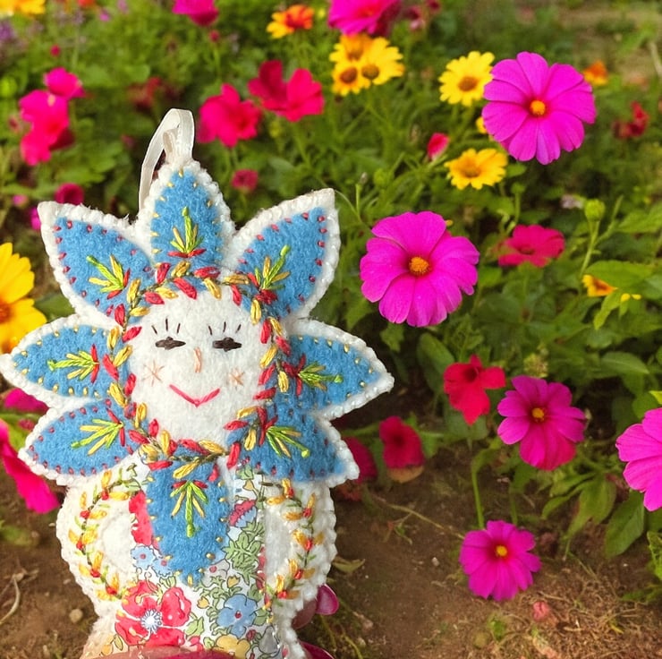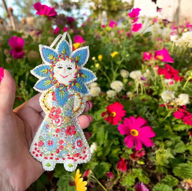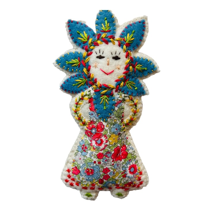 This adorable !00% wool felt handcrafted embroidered hanging decoration has been carefully made by me and features intricate details and vibrant colours. I have used Liberty Print Tana Lawn in the pattern ‘Amelie’ for her dress and backstitch,straight stitch,chain stitch and over stitch to decorate her. She is stuffed with pure wool fleece from the UK ,making her a totally sustainable product.