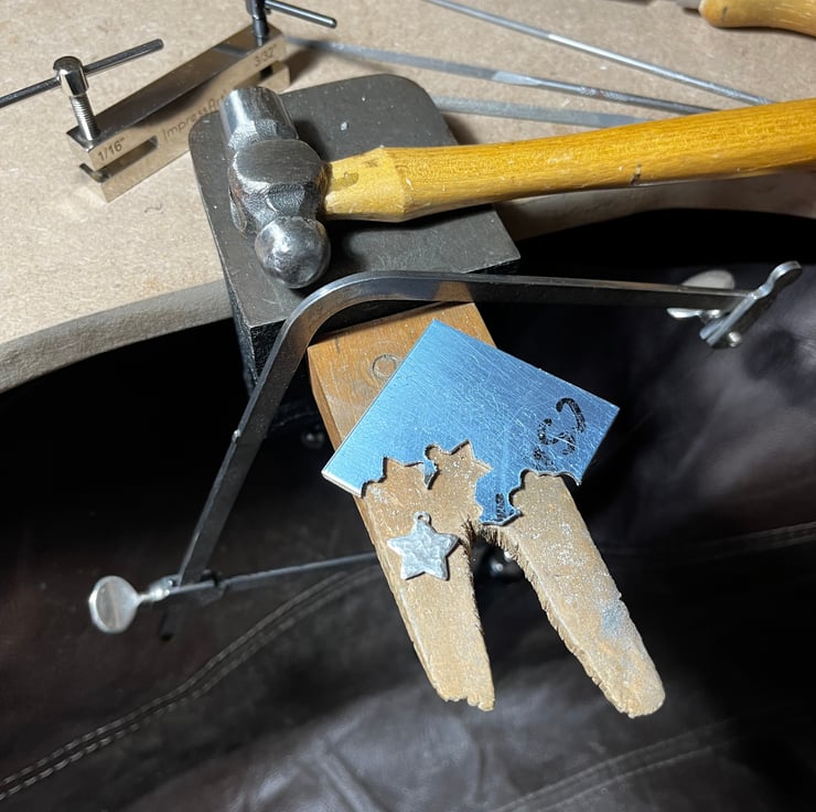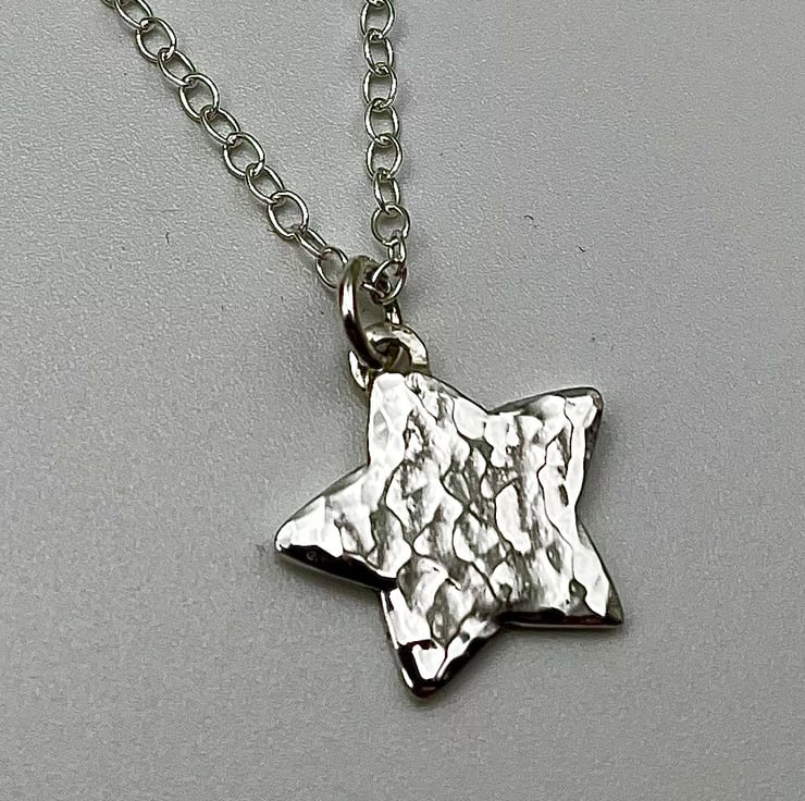 This sterling silver star pendant is hand drawn onto a piece of sheet silver, saw pierced out, hammered for a delicate texture and when polished it catches the light and twinkles. It hangs from a fine trace chain, please choose the length required 40cm (16”) or 45cm (18”). So sweet, perfect for that superstar in your live or just a treat for yourself.
