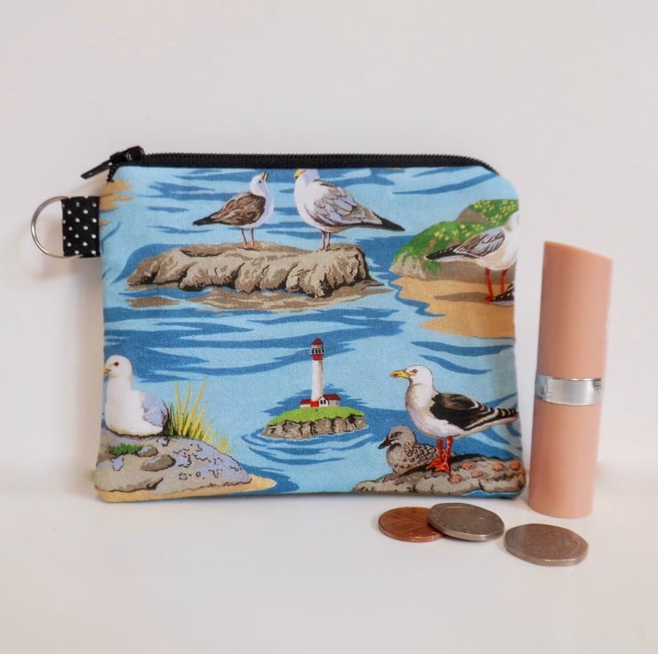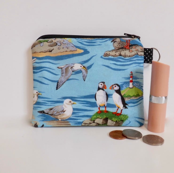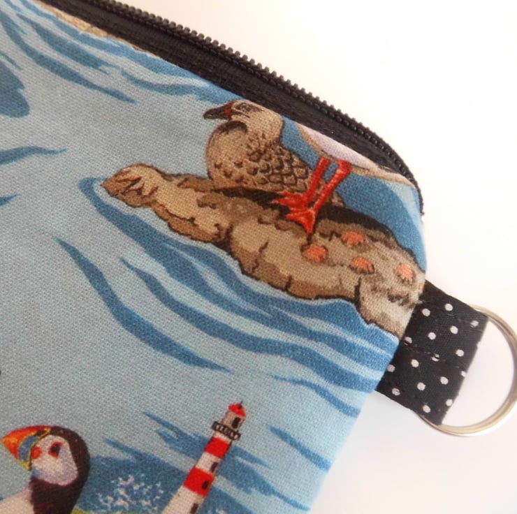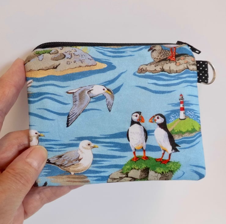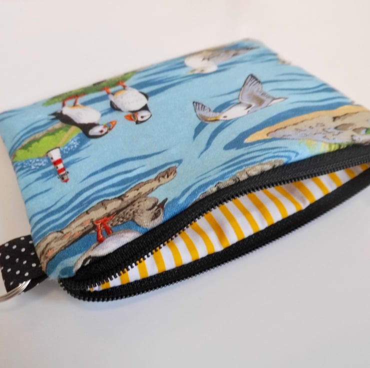 This zipped purse is made with a quality quilting cotton with seabirds, puffins and gulls, printed on a blue background. I backed this fabric with fusible quilter's wadding and lined it with yellow and white striped cotton. It measures approximately 13cm x 10cm.