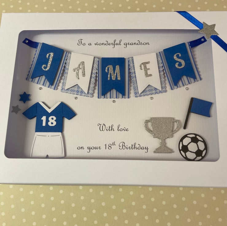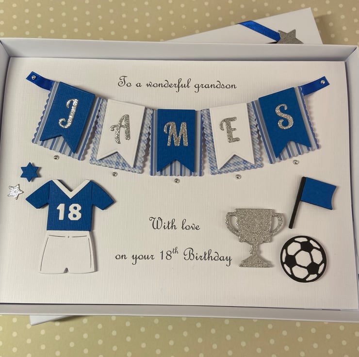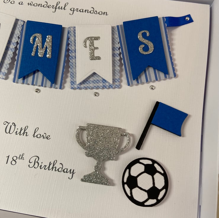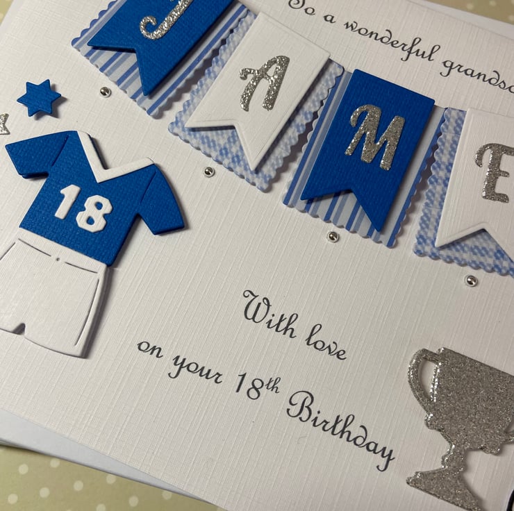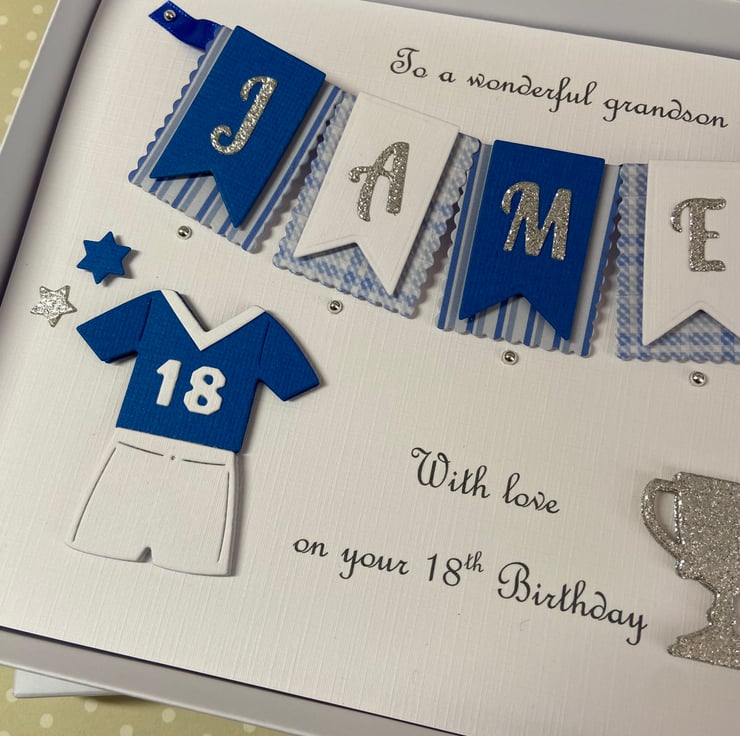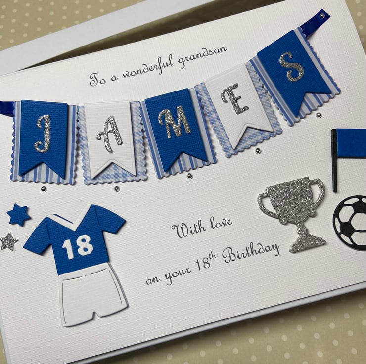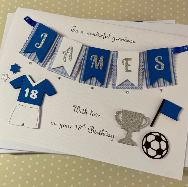 This handmade personalised card is A5 in size ( 210mm x 150mm) and is on 300gsm heavyweight linen card. I can fit a name of up to seven letters on the bunting. This card can be for any birthday or any special occasion. Any age can be put on the football shirt or it can be left blank.