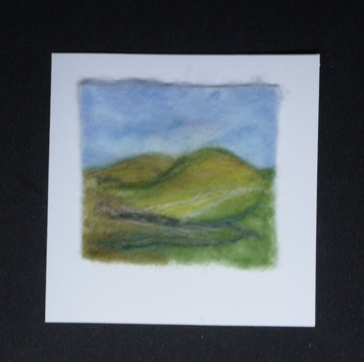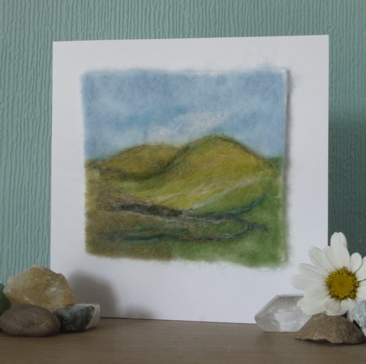 Handmade needle felted 6 x 6 inch blank greetings card featuring an country hills inspired image. The card will come with a matching envelope inside a cellophane bag.