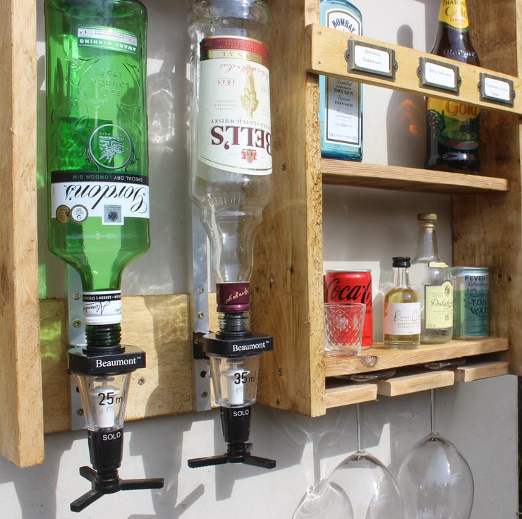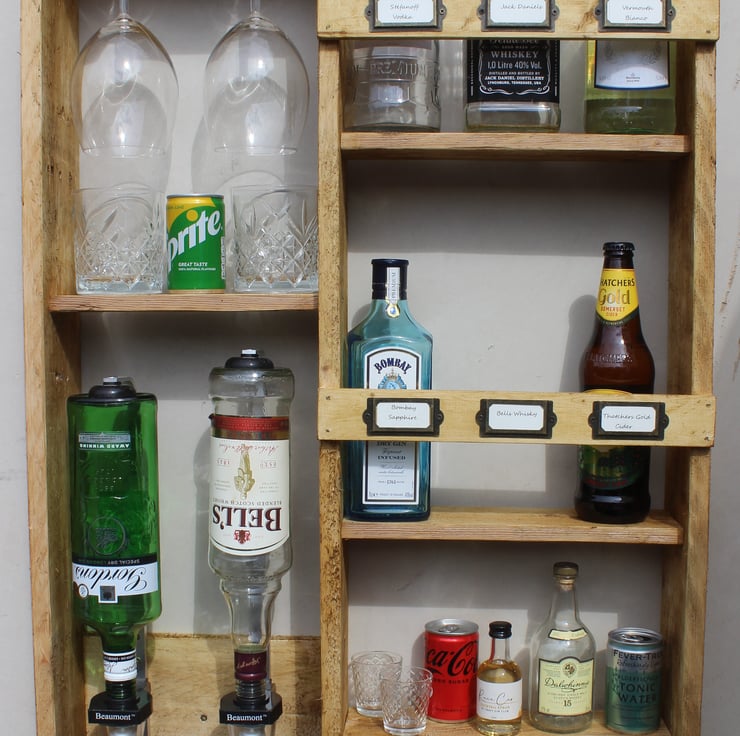 8 mixed spirit bottles storage rack, 2 on optics & 6 stored on 2 shelves, with room for 4 goblet glass's and 2 shelves for other glass's & mixers etc.