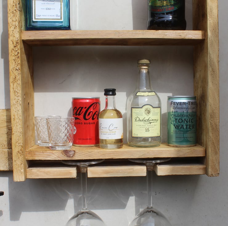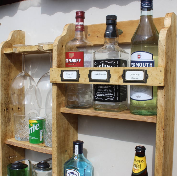 Hand made from re cycled wood, 6 metal name holders in bronze colour are fixed to the front of the 2 shelves to list some of your favourite spirits.