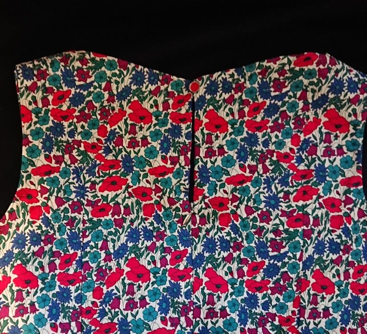 A completely hand sewn unlined short sleeveless Liberty print summer dress with a v neck made of 100% cotton Lasenby cotton Liberty iconic print floral design Poppy and Daisy. The dress has a v neck at the front and a high neck at the back with a button to fasten the small slit back opening. The back seam then fastens with a concealed zip.