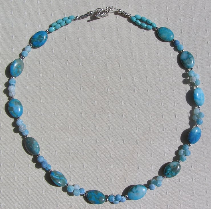This Stunning Necklace is made wholly from Shades of Turquoise... Crazy Lace Agate Oval beads matched with Frosted Blue Agate round beads, clustered together in four’s, and a final flourish of Turquoise Magnesite small barrel-shaped beads - a marvellous Celebration of the colour Turquoise that will look stunning either worn casually or with something more Elegant for a Special Evening out