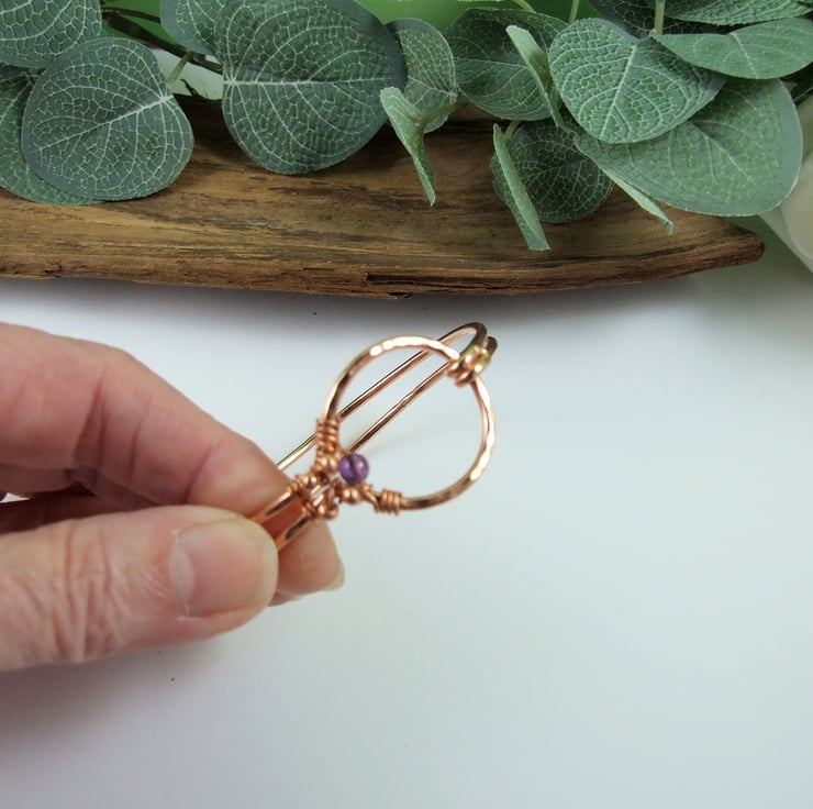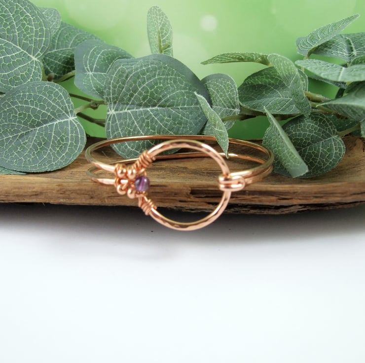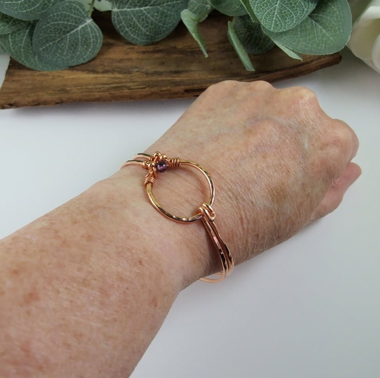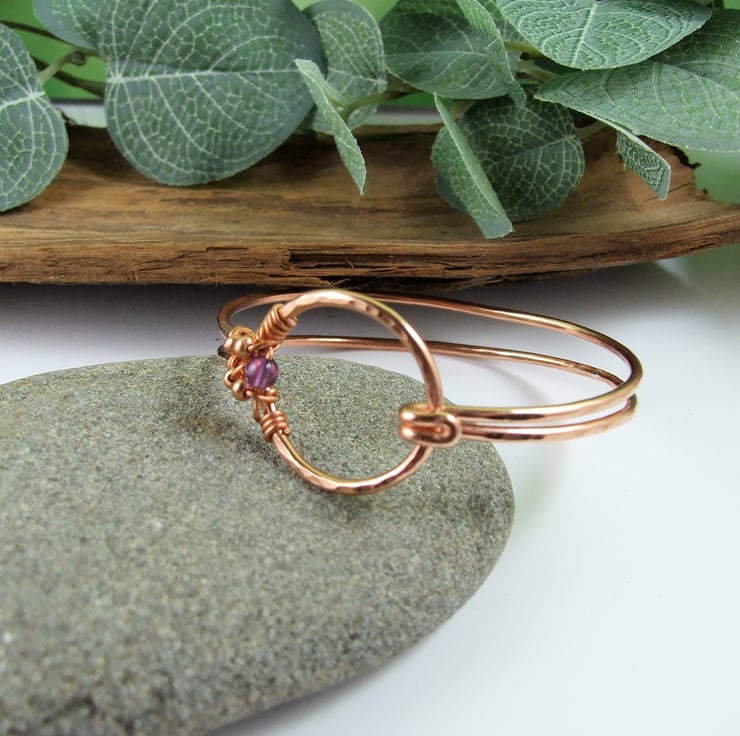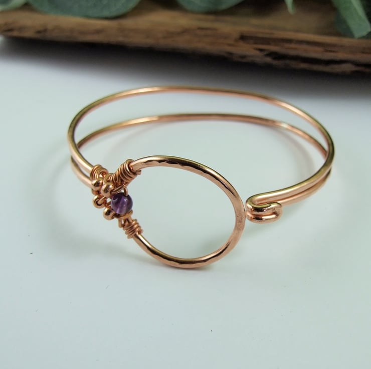 I have made the bangle from 2mm solid copper wire which I have doubled over and shaped into a freeform design. To this I have added a small 4mm Amethyst gemstone and some tiny copper beads securely and individually wire wrapped in place.